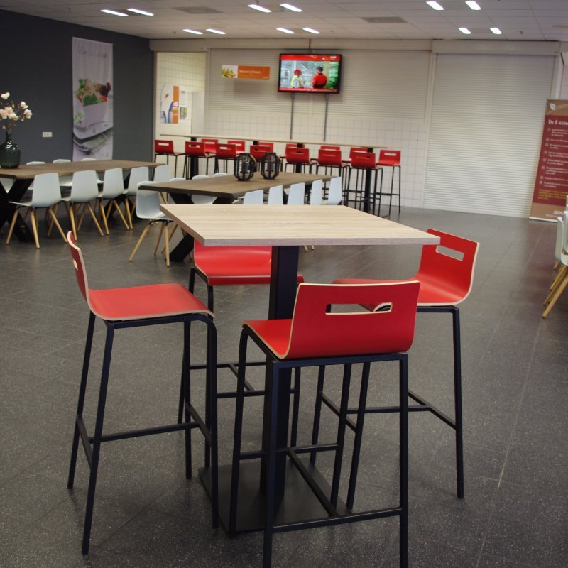 De bartafel wordt gecombineerd met een melamine tafelblad in diverse kleuren. De kolomtafel is een praktische toevoeging voor de kantine en kantooromgeving en laat zich makkelijk combineren met diverse stoelen en treinbanken.