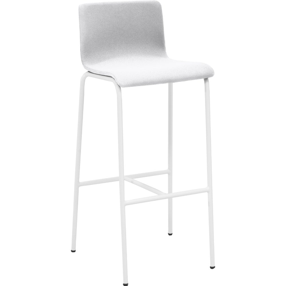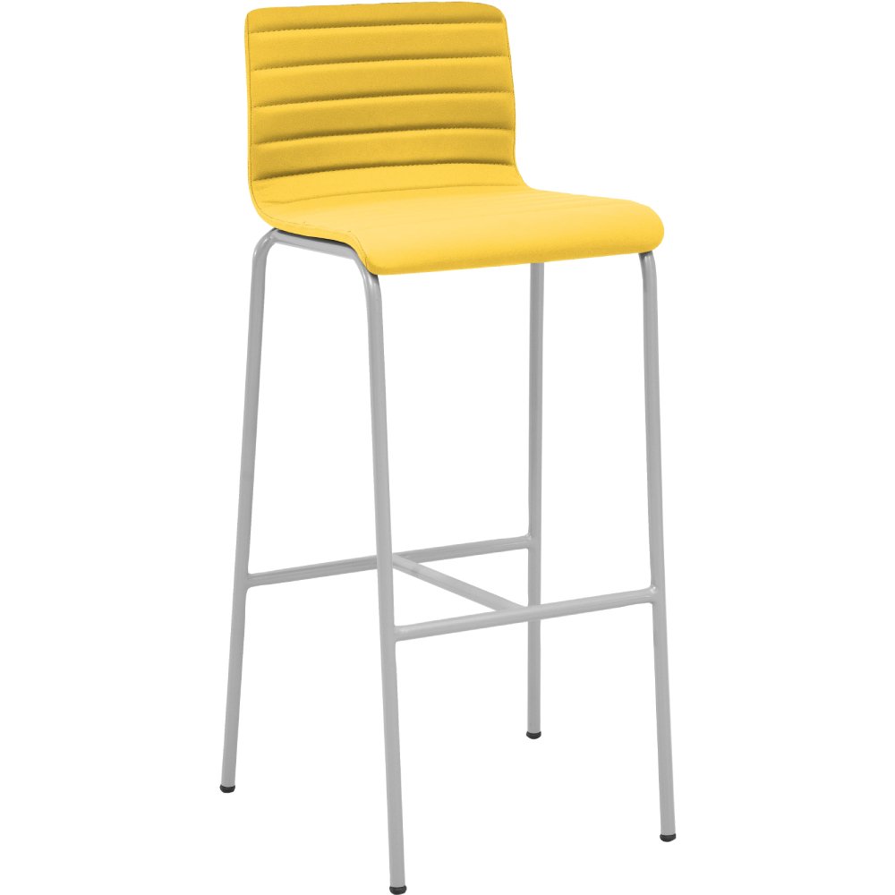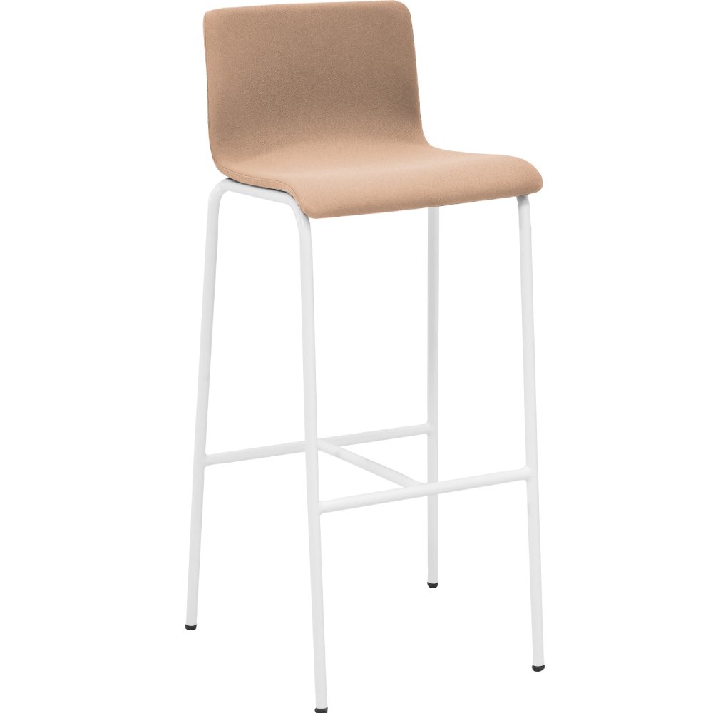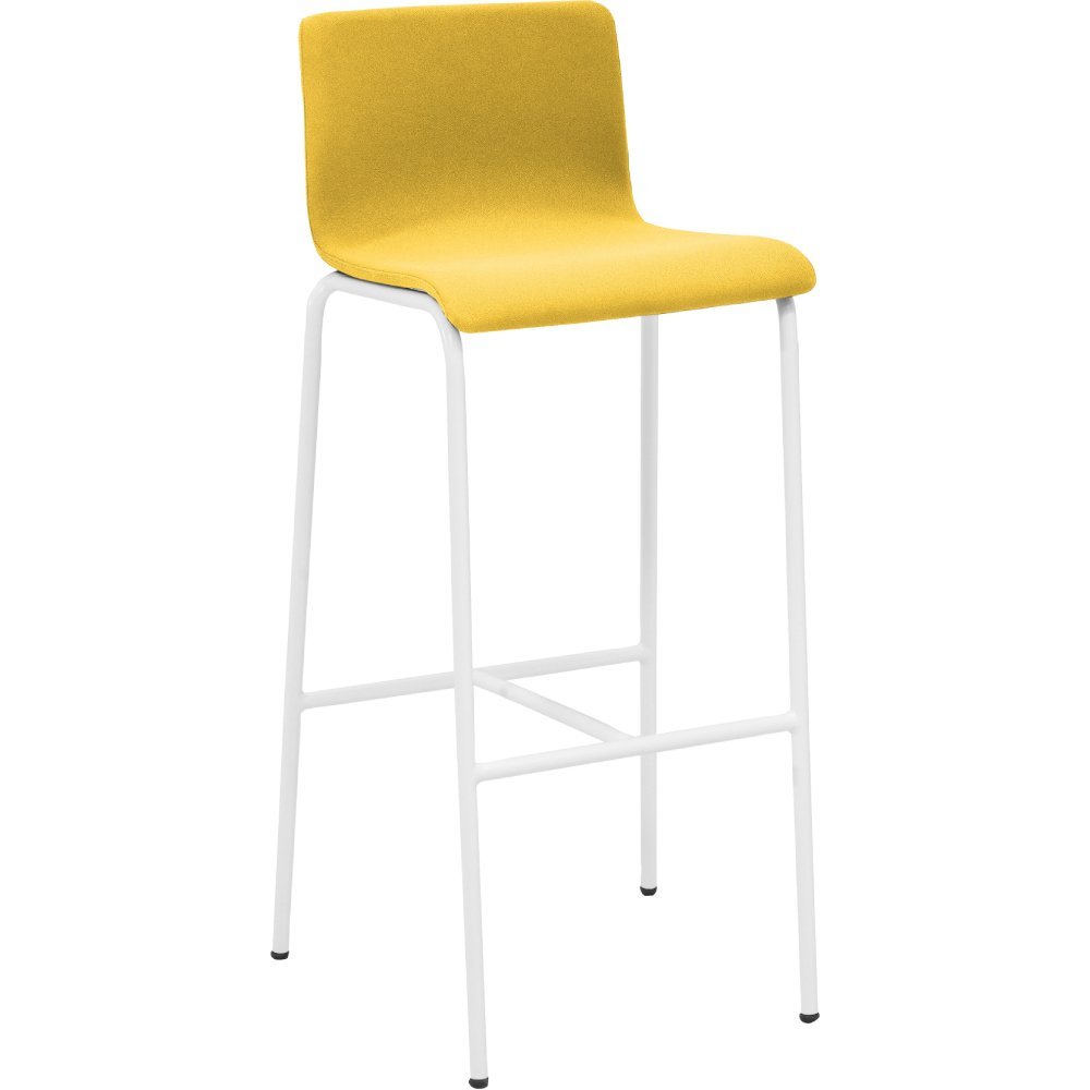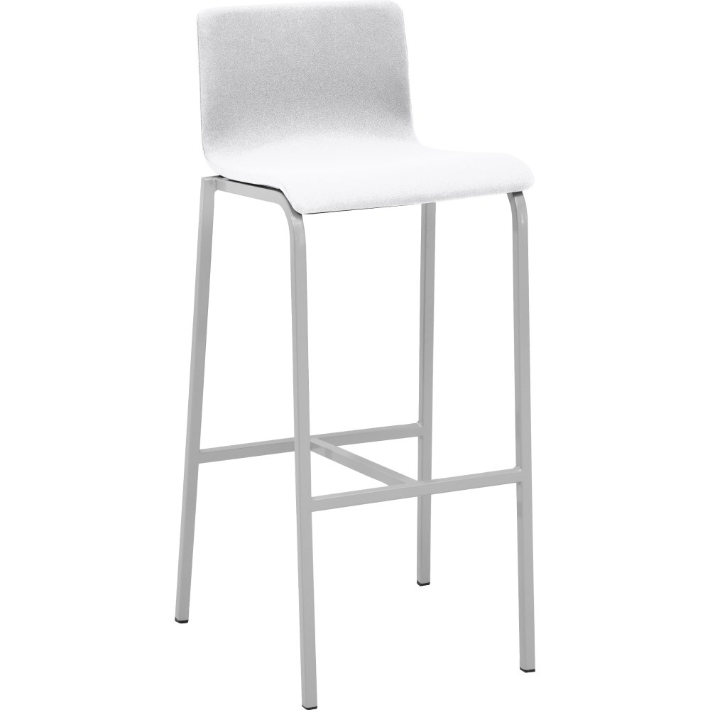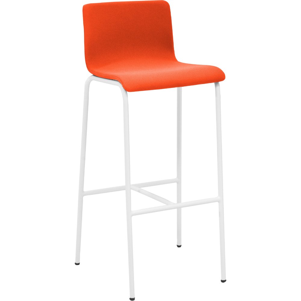 De hoge barkruk is voorzien van een lage rugleuning en voetensteun. De poten van deze fraaie kruk hebben ieder een afmeting van 2x2cm of Ø1,9cm en kan geleverd worden in diverse kleuren.