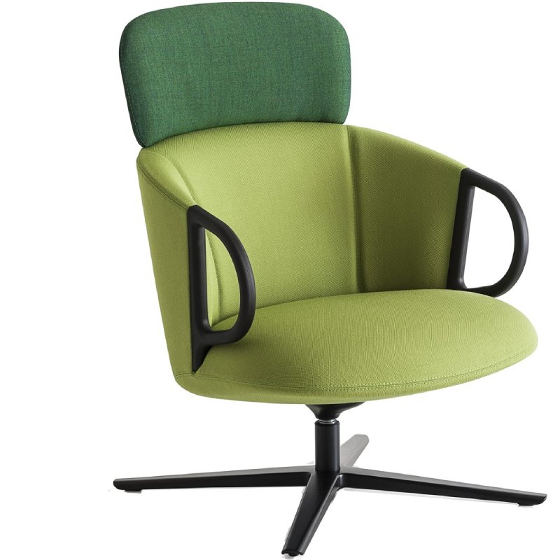 Comfortabele volledig gestoffeerde fauteuil met een 4 dimensionaal swivelframe en geïntegreerde zachte polyurethaan kunststof armleggers.