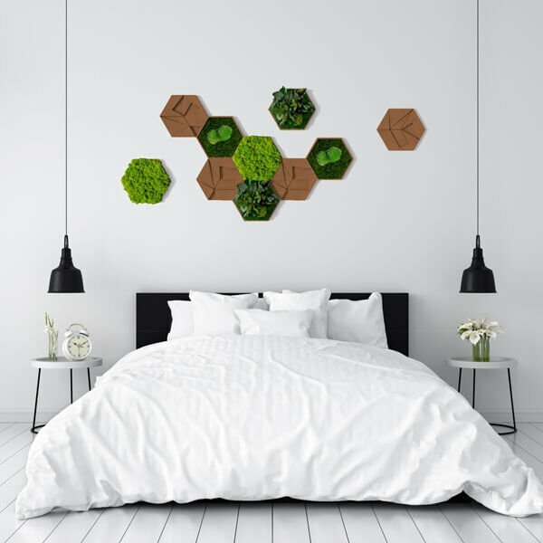 De zeshoeken bestaan uit 100% natuurlijke kurk. De vegetatie bestaat uit 100% echt, natuurlijk bewaard gebleven mos en planten. De mos en planten die gebruikt worden voor de mospanelen, worden op gecertificeerde boerderijen gekweekt en gecultiveerd. Door natuurlijke conservering worden de planten permanent mooi gehouden. De mospanelen hebben 0% zorg of verlichting nodig en blijven altijd groen.