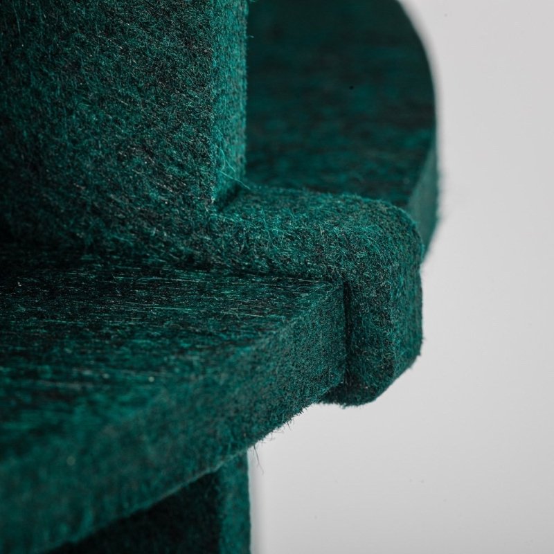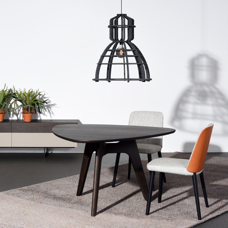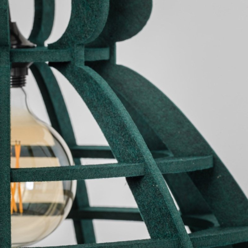 De Dutch Design lamp is gemaakt van 100% gerecycled PET felt. Dit viltachtige materiaal wordt gemaakt van weggegooid plastic en wordt in Nederland gemaakt. De hanglamp bestaat uit 15 onderdelen, welke zonder lijm of andere bevestigingsmaterialen in elkaar kan worden gezet. Hierdoor worden zo min mogelijk grondstoffen verbruikt. Daarnaast werkt PET felt geluidsabsorberend.