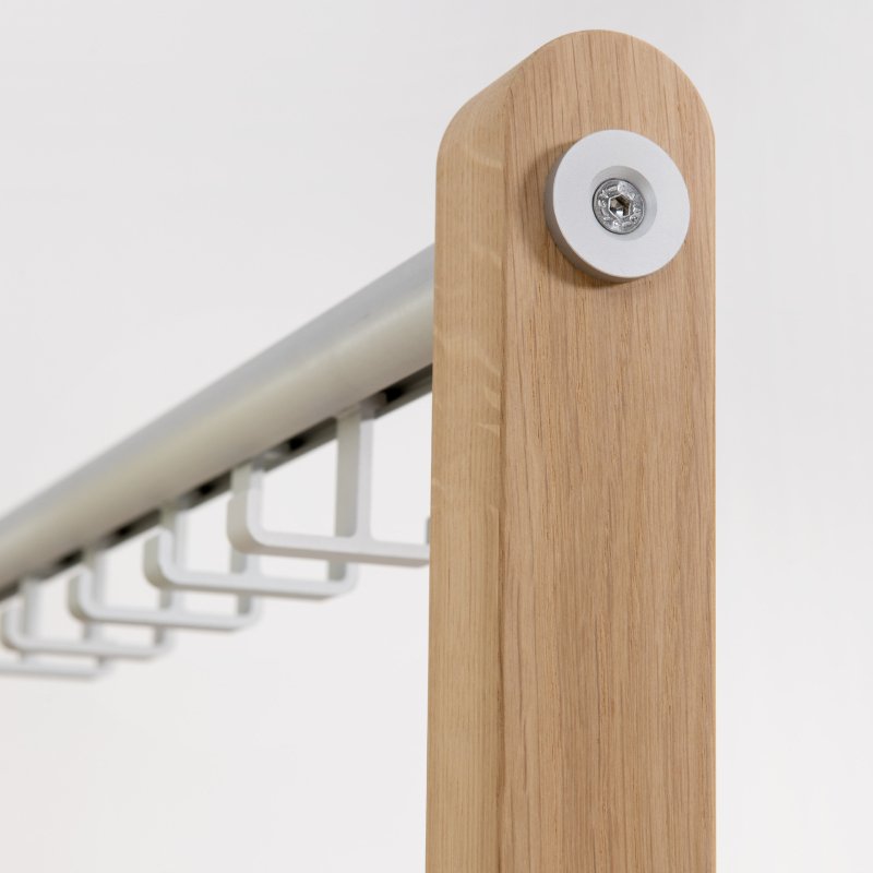 Afmetingen kapstok Round20 Wood: 43, 63, 83, 103, 123 of 163cm breed x 50/70cm diep x 180cm hoog.