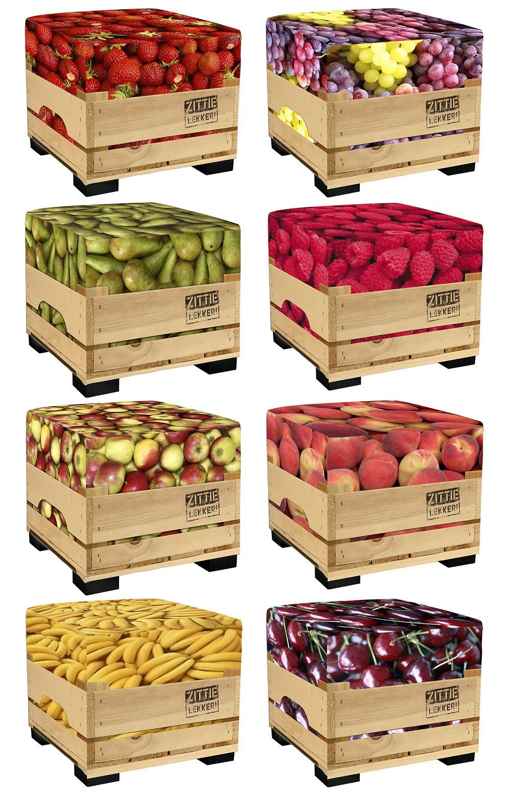 Naast de poef met aardbei print, zijn er ook andere hockers en poefen met print.