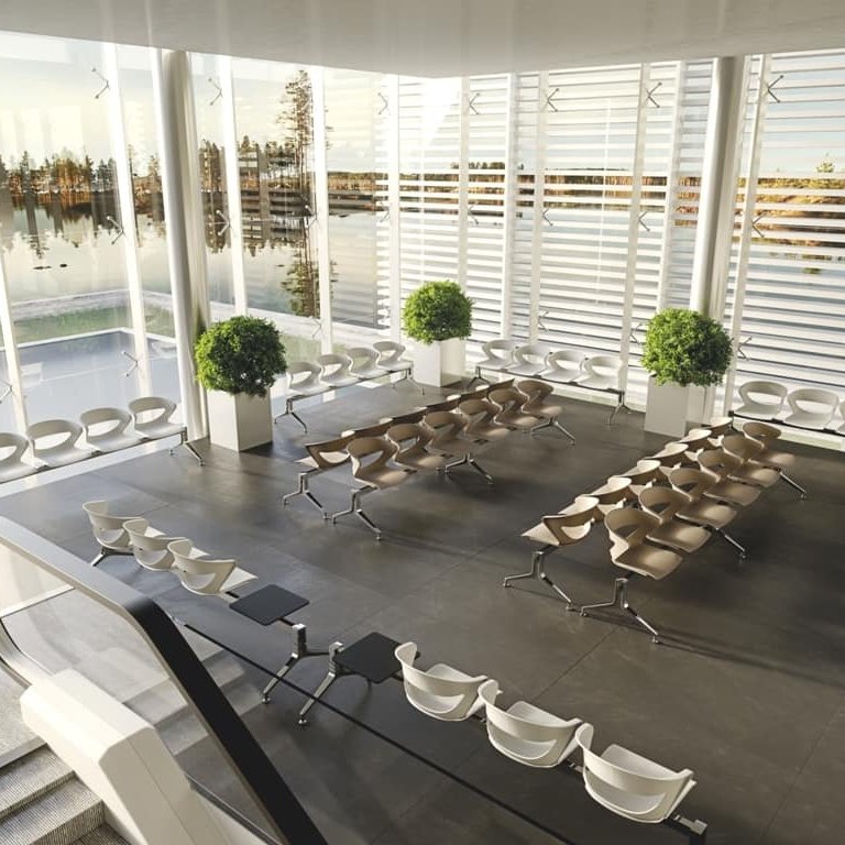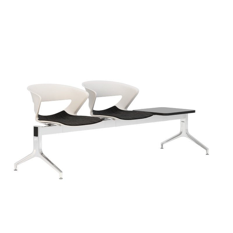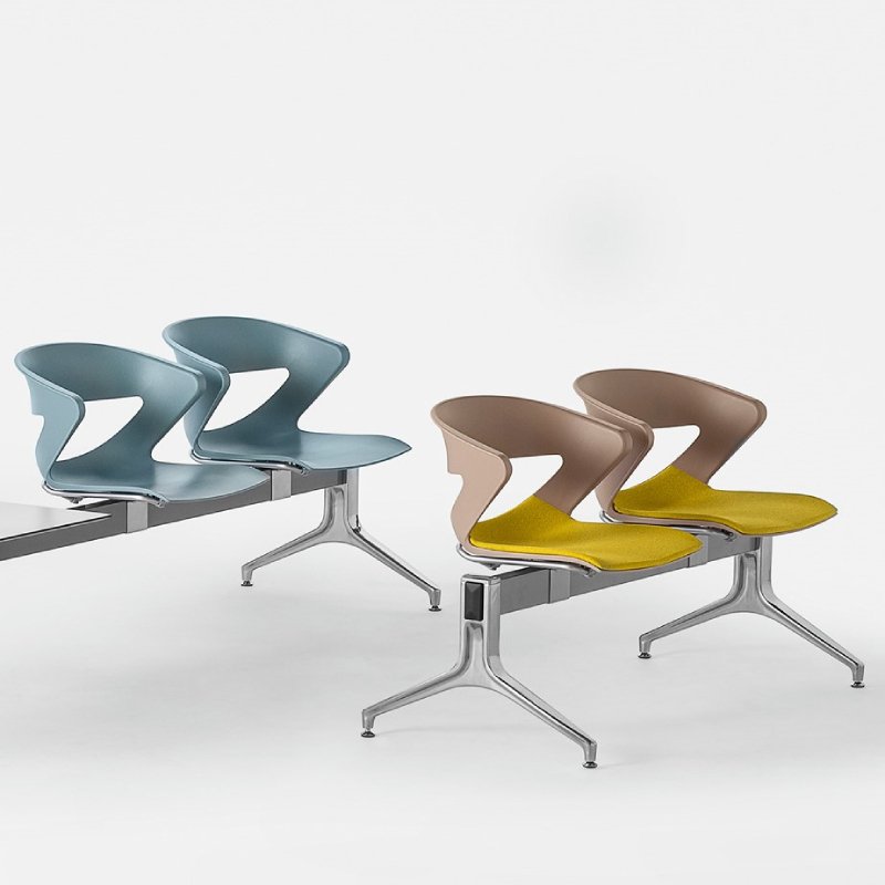 Het onderstel van de wachtbank is mogelijk in aluminium geverfd staal of als aluminium gepolijst staal. Voor meer zitcomfort voor uw bezoekers kunt u stoffering aan de zitting of aan de rugleuning en zitting toevoegen. Deze stoffering is ook mogelijk in diverse kleuren. Vraag naar de mogelijkheden.