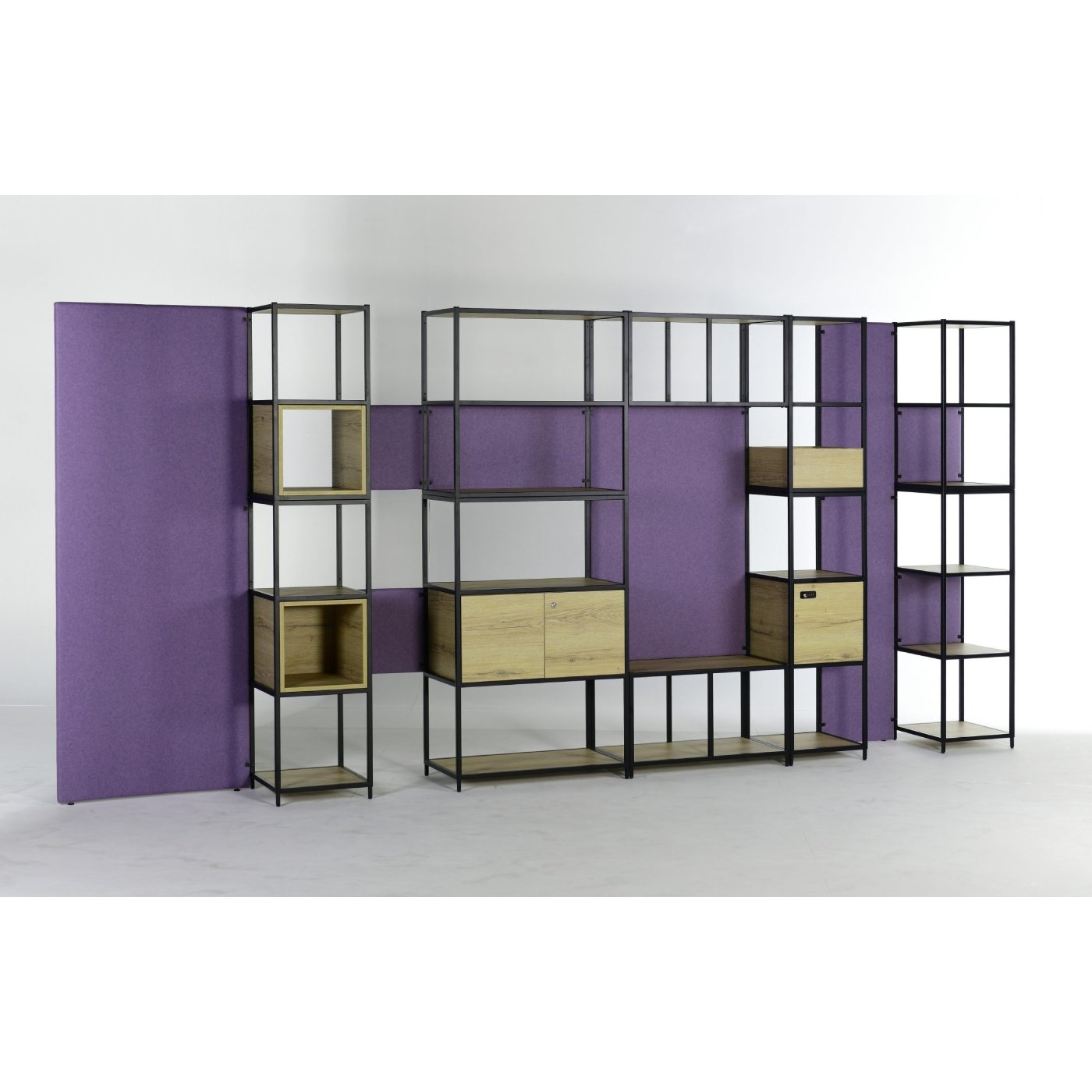 De vakkenkast is opgebouwd uit diverse stalen onderdelen, opbergelementen en akoestische panelen. Hierdoor is deze wandkast een multifunctioneel meubelstuk voor op de werkvloer. De Flexwall 6 opstelling wordt niet alleen als opbergkast gebruikt, maar ook als ruimteverdeler. Ideaal in een open kantoorruimte.
