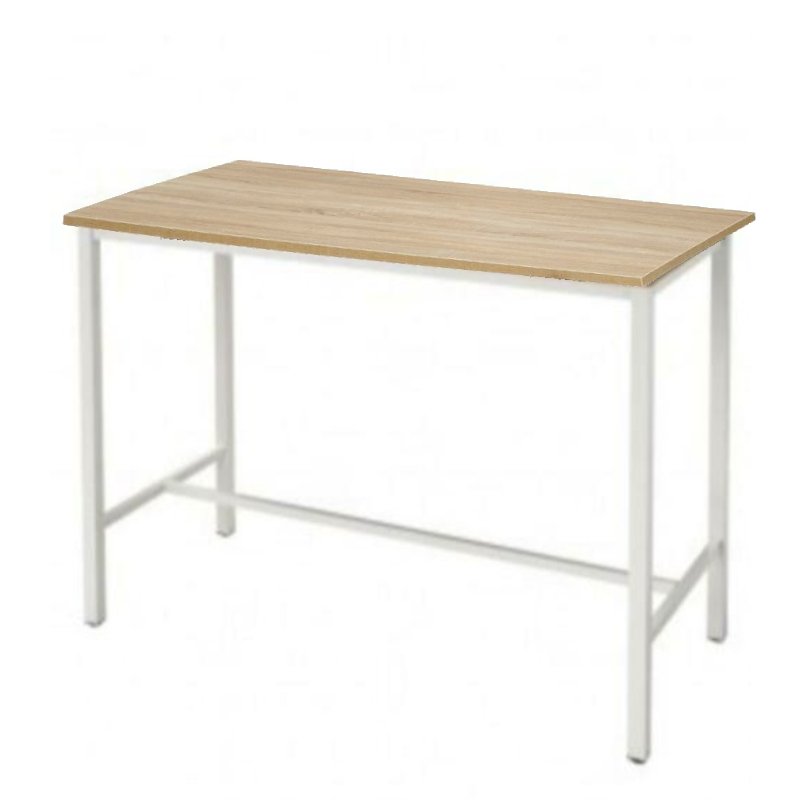 De afgeprijsde tafel heeft een stalen onderstel van 110cm hoog in witte kleur en een melamine blad in halifax eiken. Combineer de tafel uit de kantoormeubelen outlet met barkrukken voor een complete set.