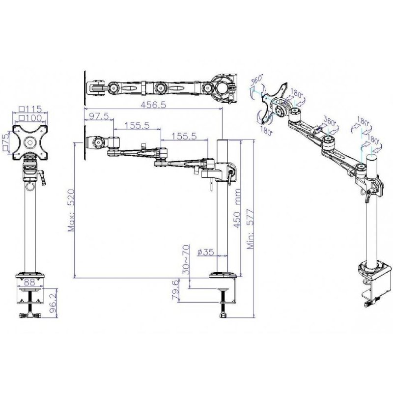 De monitorarm is geschikt voor monitoren tot 28" met een monitorgewicht tot maximaal 14 kg. De paalhoogte van de monitorarm op het bureau is 45cm met een diameter van 3,5cm. De monitorarm is 360 graden draaibaar en 180 graden neigbaar en zwenkbaar.