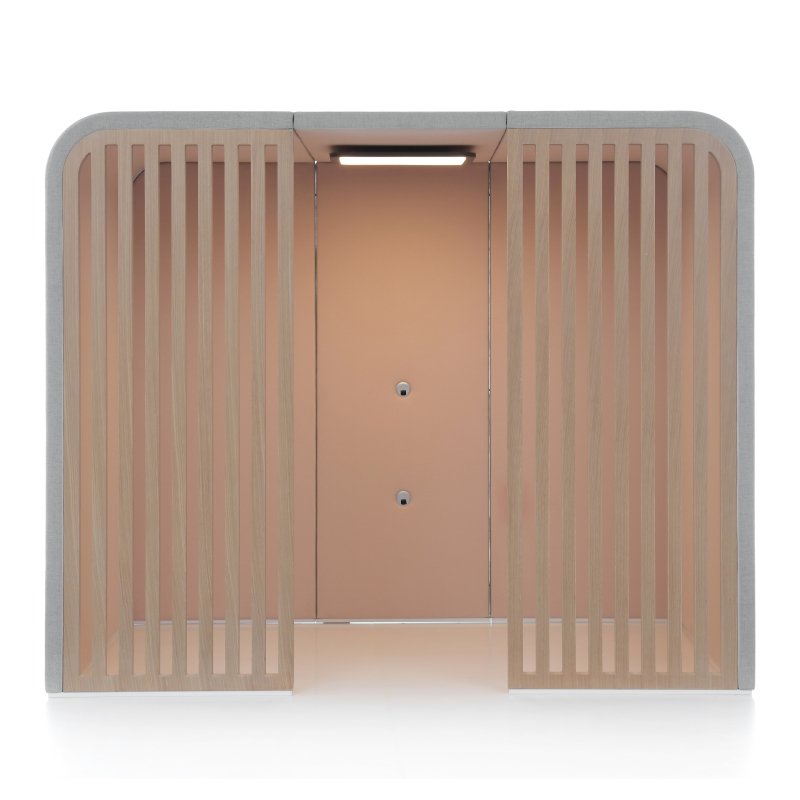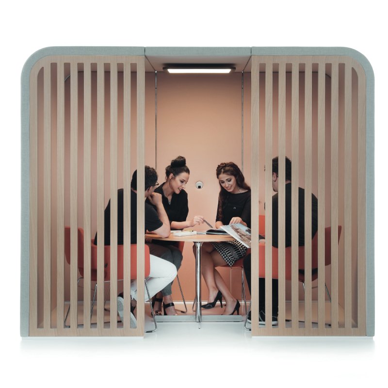 Overlegplek Chalet Closed, een gestoffeerde unit waar u rustig kunt overleggen of samenwerken. Ook geschikt als u wat meer privacy of minder afleiding wil van de werkvloer.