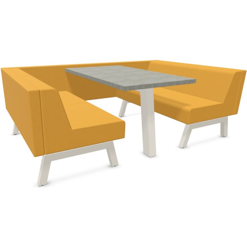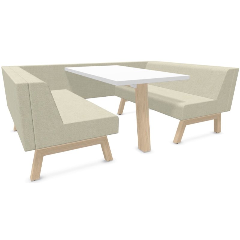 Dit model heeft een lage rug en biedt zitplaatsen voor 4 personen. De comfortabele zittingen en de wangen zijn gestoffeerd en leverbaar in diverse kleuren. De vergadertafel heeft een afmeting van 134cm breed x 80cm diep en is voorzien van een 25mm melamine tafelblad dat leverbaar is in diverse bladkleuren.
