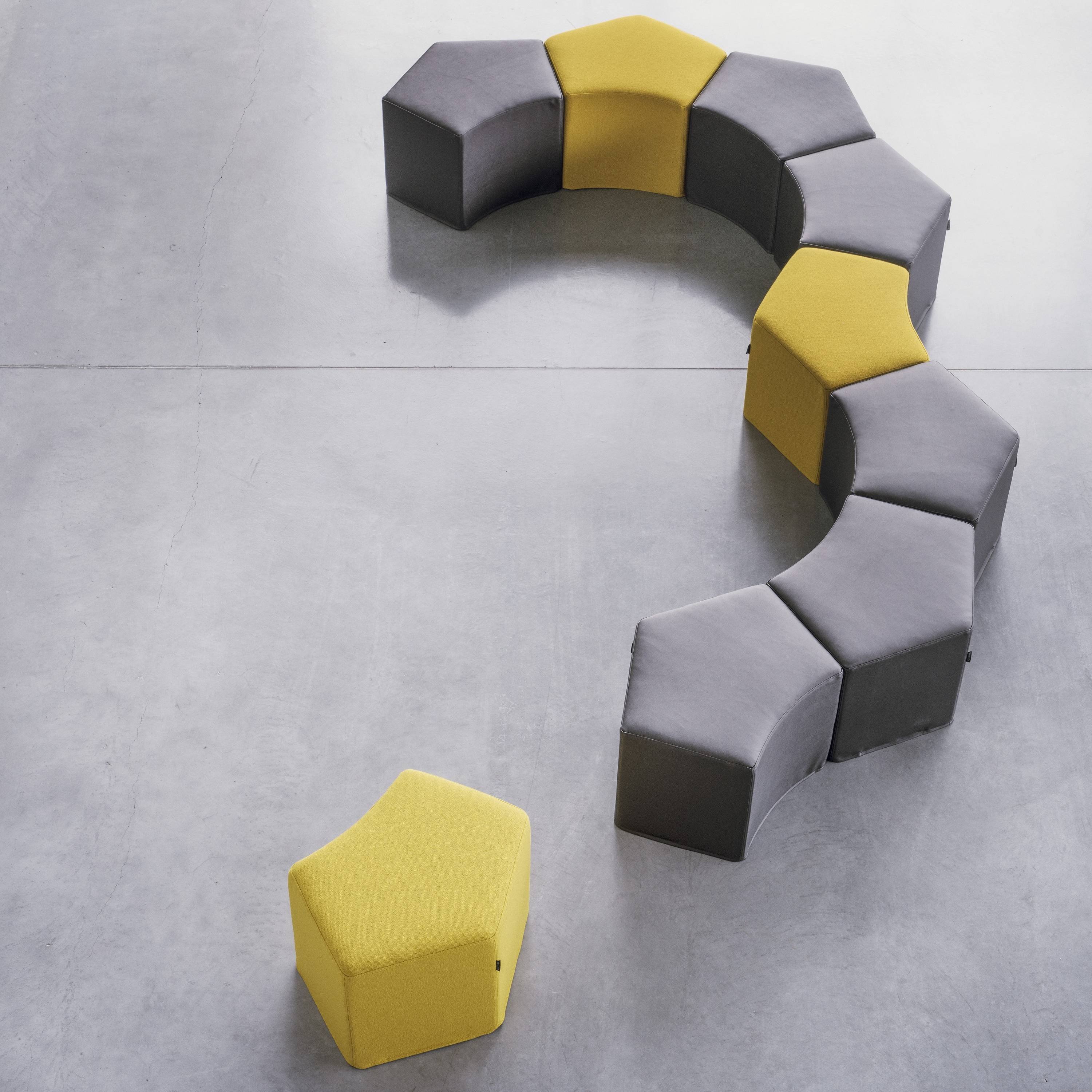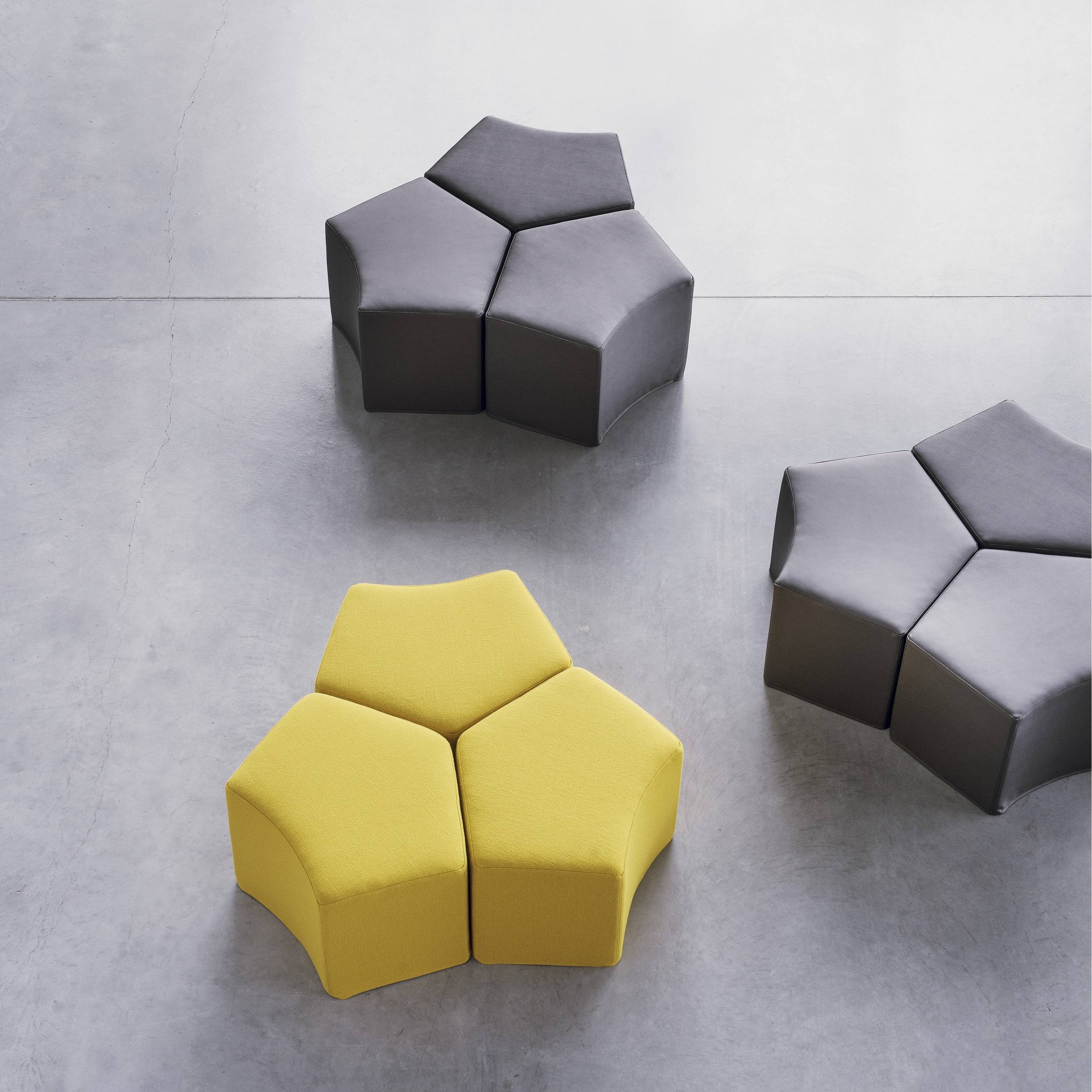 Poef Pause, een multifunctionele poef die ideaal is voor ruimtes waarin flexibiliteit gewenst is. Meerdere exemplaren Pause poefen tegen elkaar geven interessante geometrische figuren. De poef heeft bovendien een comfortabele zitting. Maak leuke opstellingen in verschillende soorten ruimtes en zithoeken met deze gestoffeerde hocker Pause.