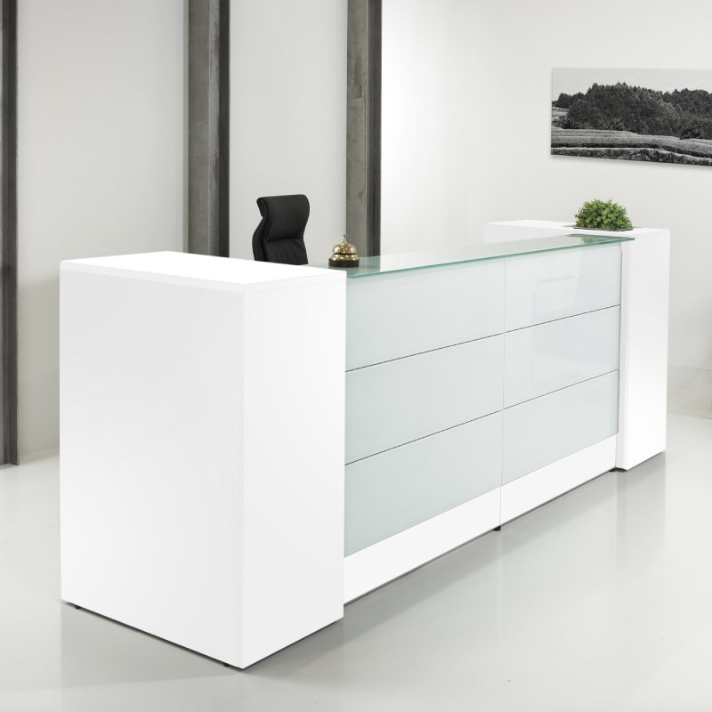 Het topblad en de voorzijde van de receptiebalie zijn voorzien van gehard glas wat bijdraagt aan de fraaie uitstraling van de balie.