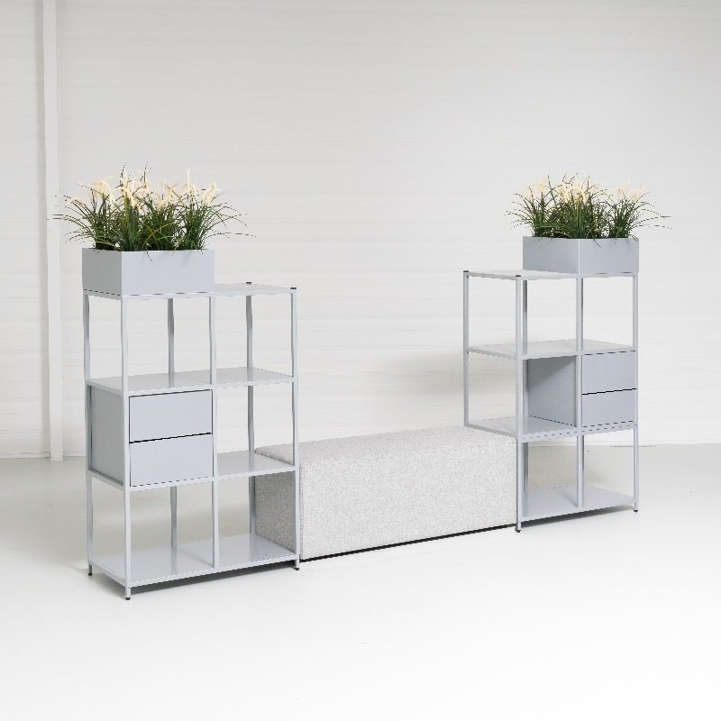 Roomdivider Flexwall 3 is een grote kast met veel opbergingsruimte. Flexwall kan als ruimteverdeler dienen, wandkast of als zitelement door de gestoffeerde zitting tussen de 2 kasten in. De vakkenkast is open aan alle kanten wat ervoor zorgt dat de kast een ruimte split, zonder een afgesloten look te geven.