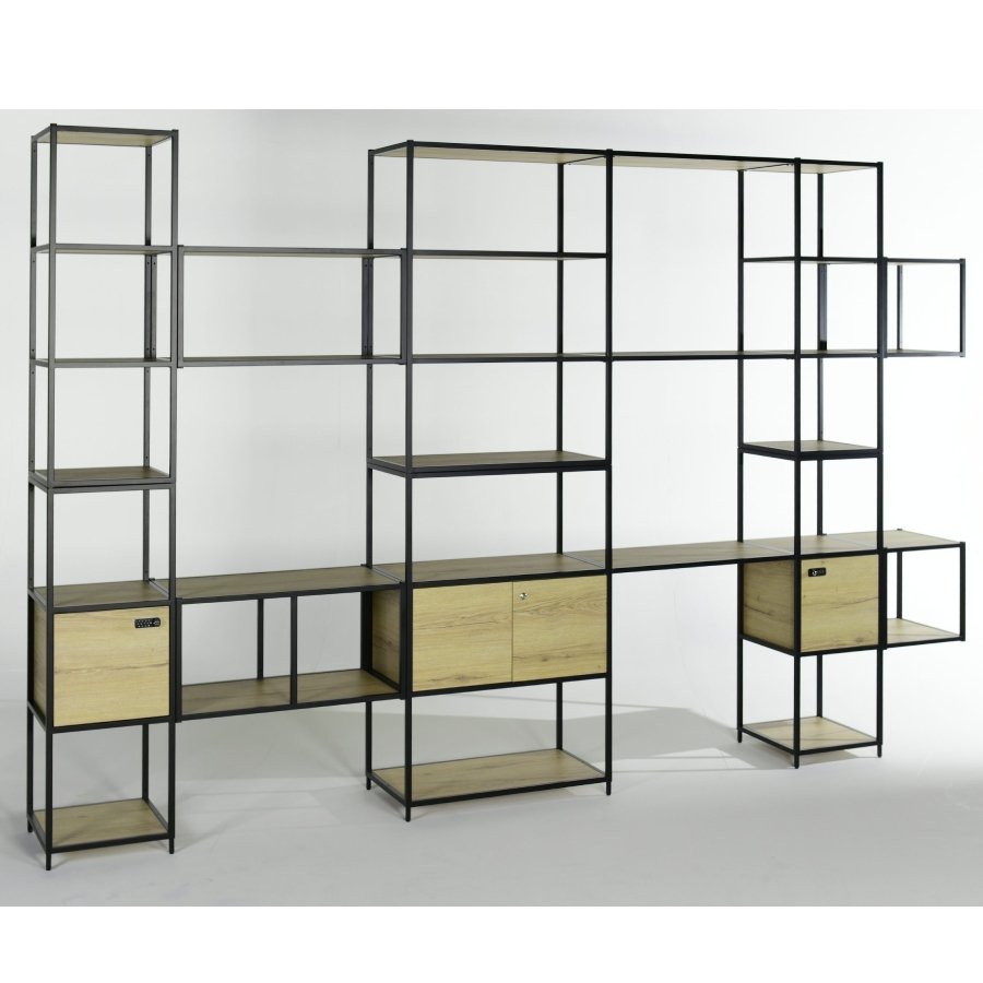 Roomdivider Flexwall voorbeeld opstelling 5 zorgt voor voldoende opbergingsruimte en combineert staal met houtkleurige elementen, waardoor de vakkenkast een industriële uitstraling krijgt.