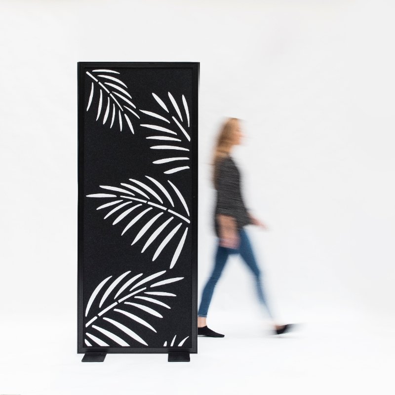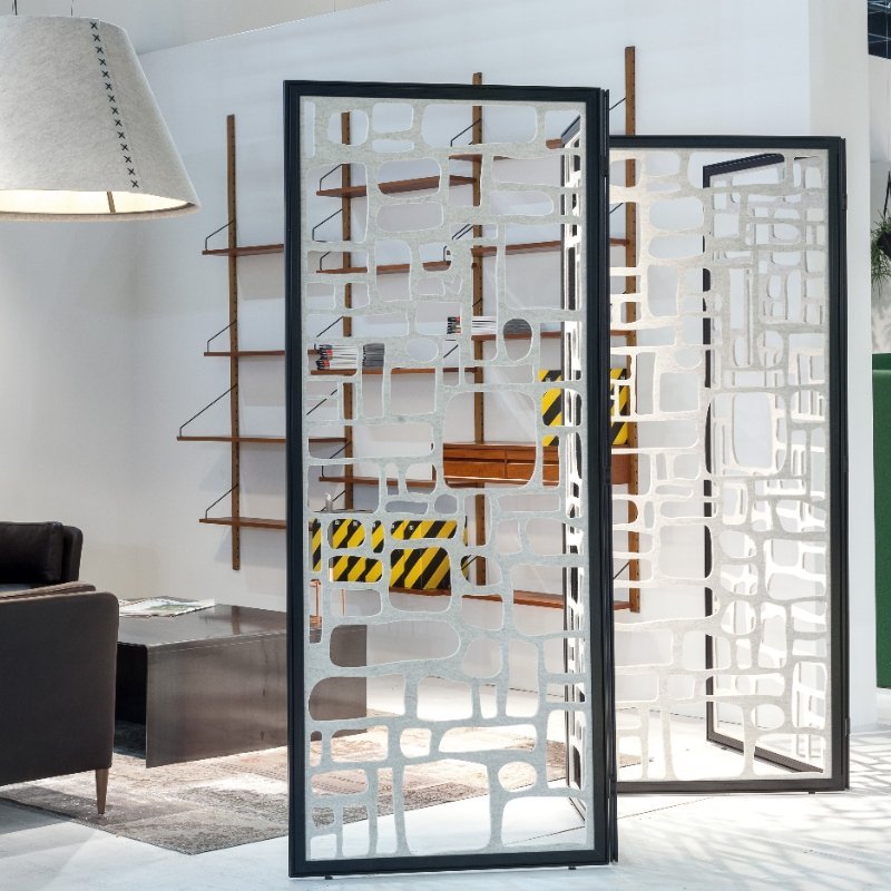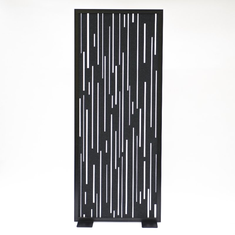 Akoestische roomdivider BuzziFalls is verkrijgbaar in diverse unieke patronen en heeft een geluiddempende werking. Verkrijgbaar als enkel vloerscherm met voetplaat of als trio. Plaats de roomdivider met drie panelen niet in een rechte lijn maar zigzaggend voor een goede stabiliteit.