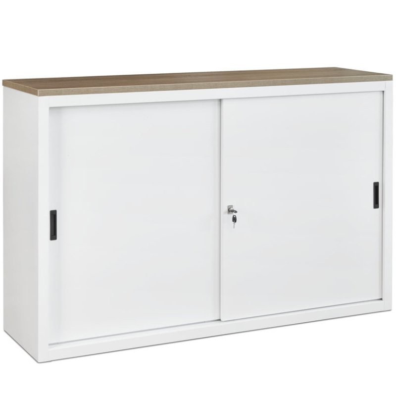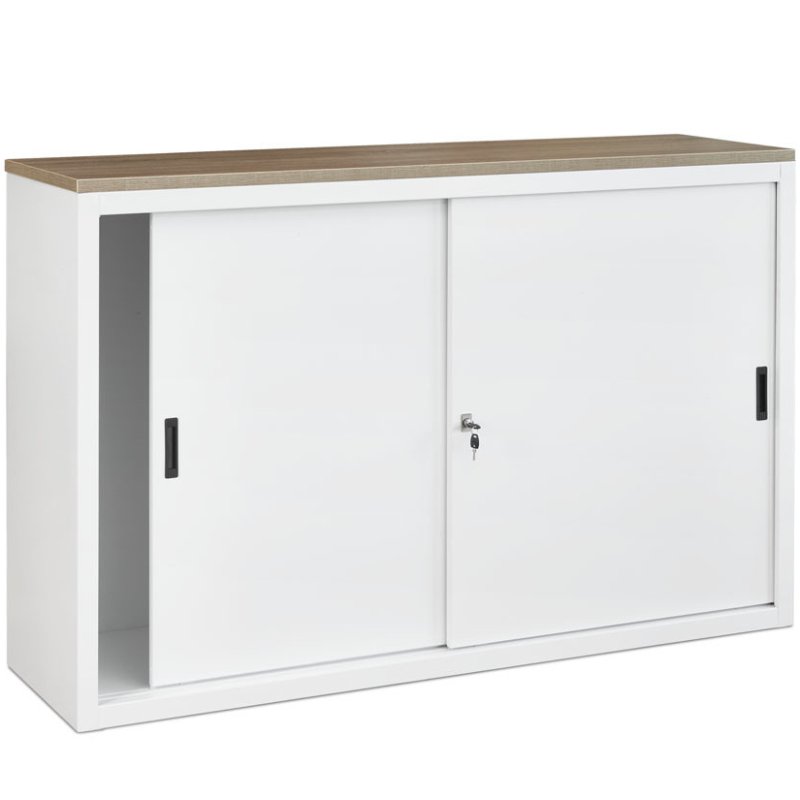 De kantoorkast met schuifdeuren is mogelijk in 2 afmetingen, diverse kleuren en een kunststof topblad.