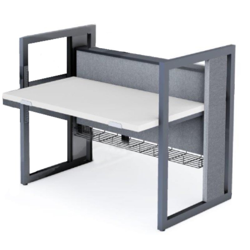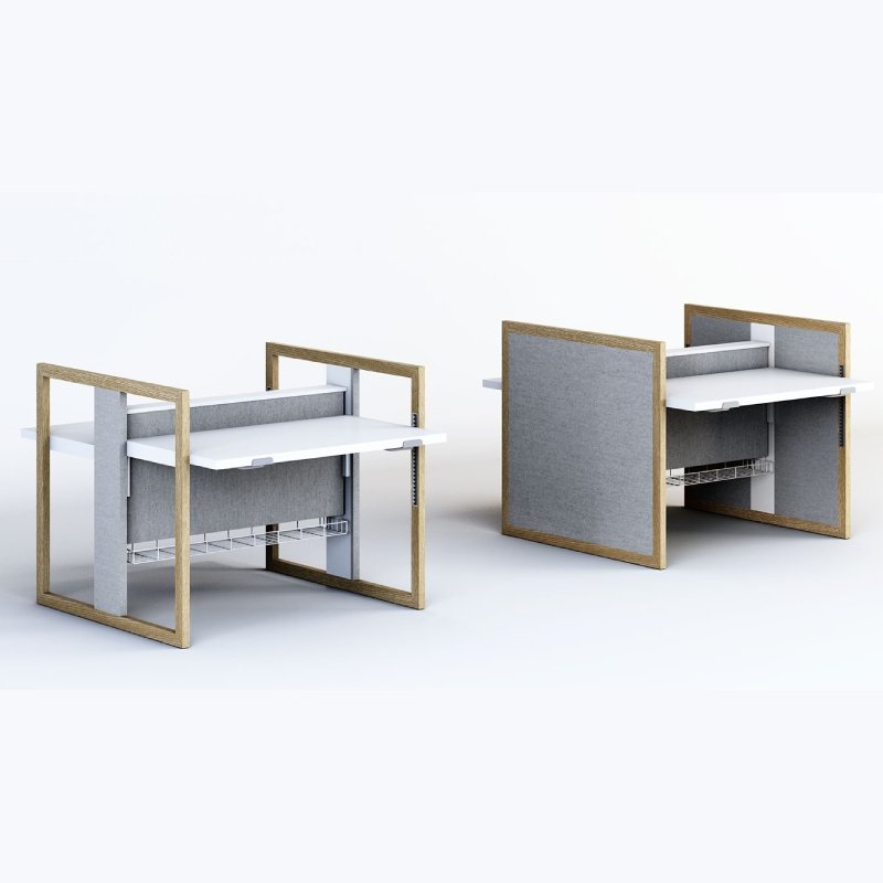 De Stand Up R bestaat uit een centrale achterwand en twee zijpanelen met gestoffeerde zijpanelen in eenkleur naar keuze. Tussen de twee zijpanelen hangt het werkblad welke door twee hendels met een soepele beweging op de juiste hoogte gebracht kan worden.