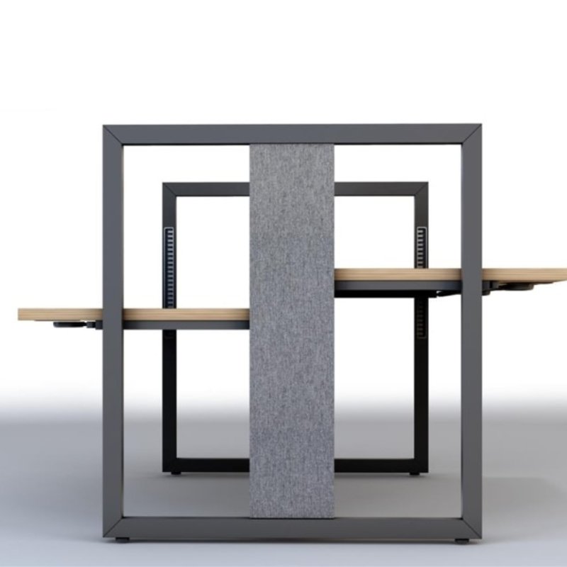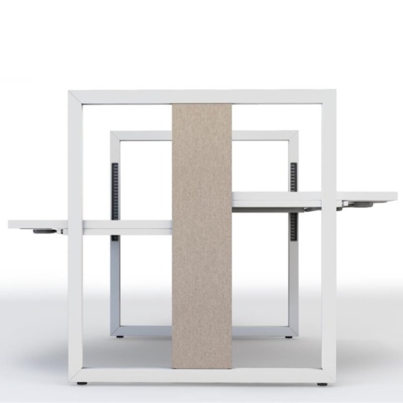 De gestoffeerde zijpanelen zijn standaard in de smalle uitvoering, waardoor u nog aan de zijkanten van het bureau een opening heeft. Liever een volledig gestoffeerde zijwand? Neem dan gerust contact met ons op.