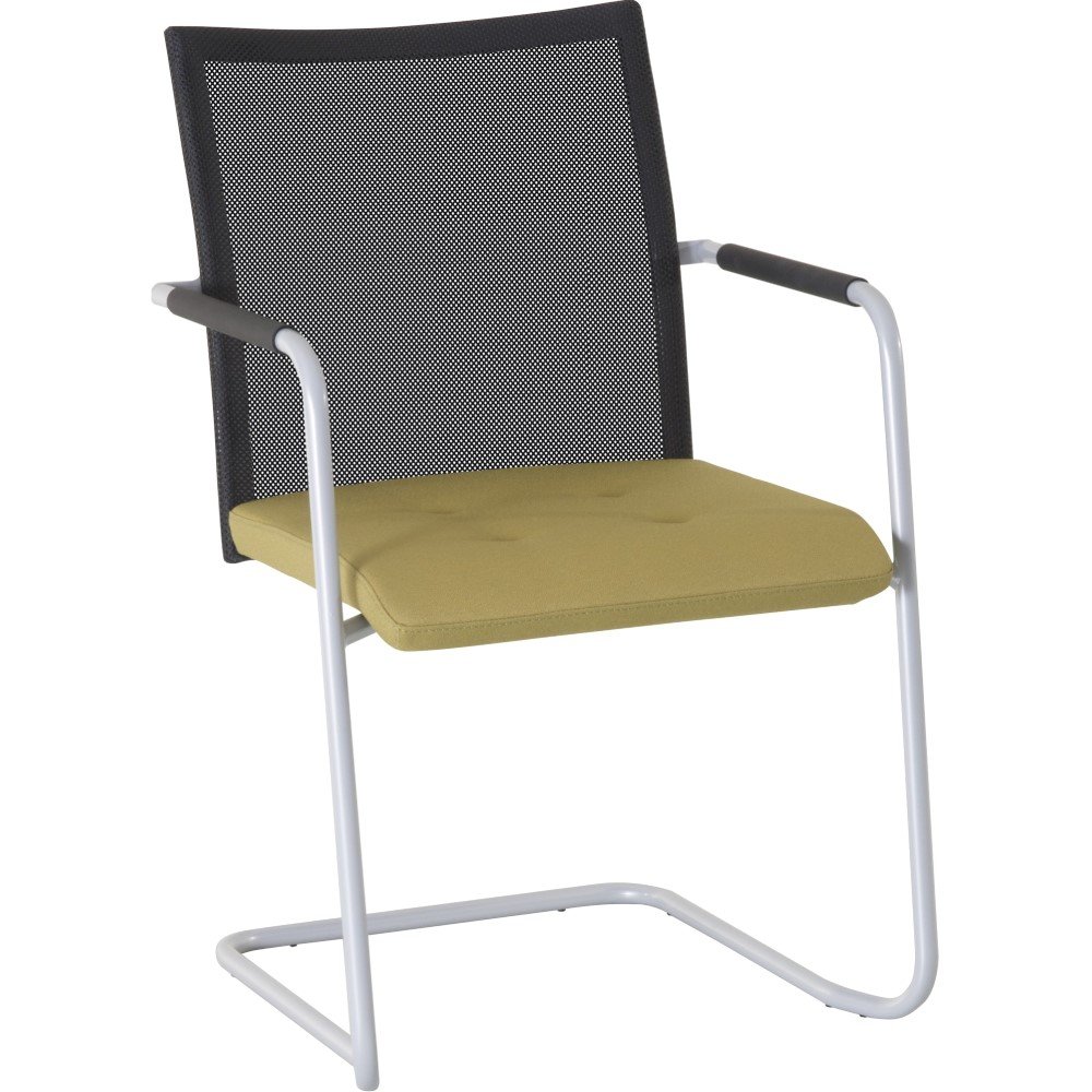 De stevige armstoel is mogelijk in 2 uitvoeringen: volledig gestoffeerd of met een zwart netbespannen rugleuning. Liever de Alfa stoel met sledeframe en een lage rugleuning? Bekijk dan vergaderstoel Alfa slede lage rug met knopen.