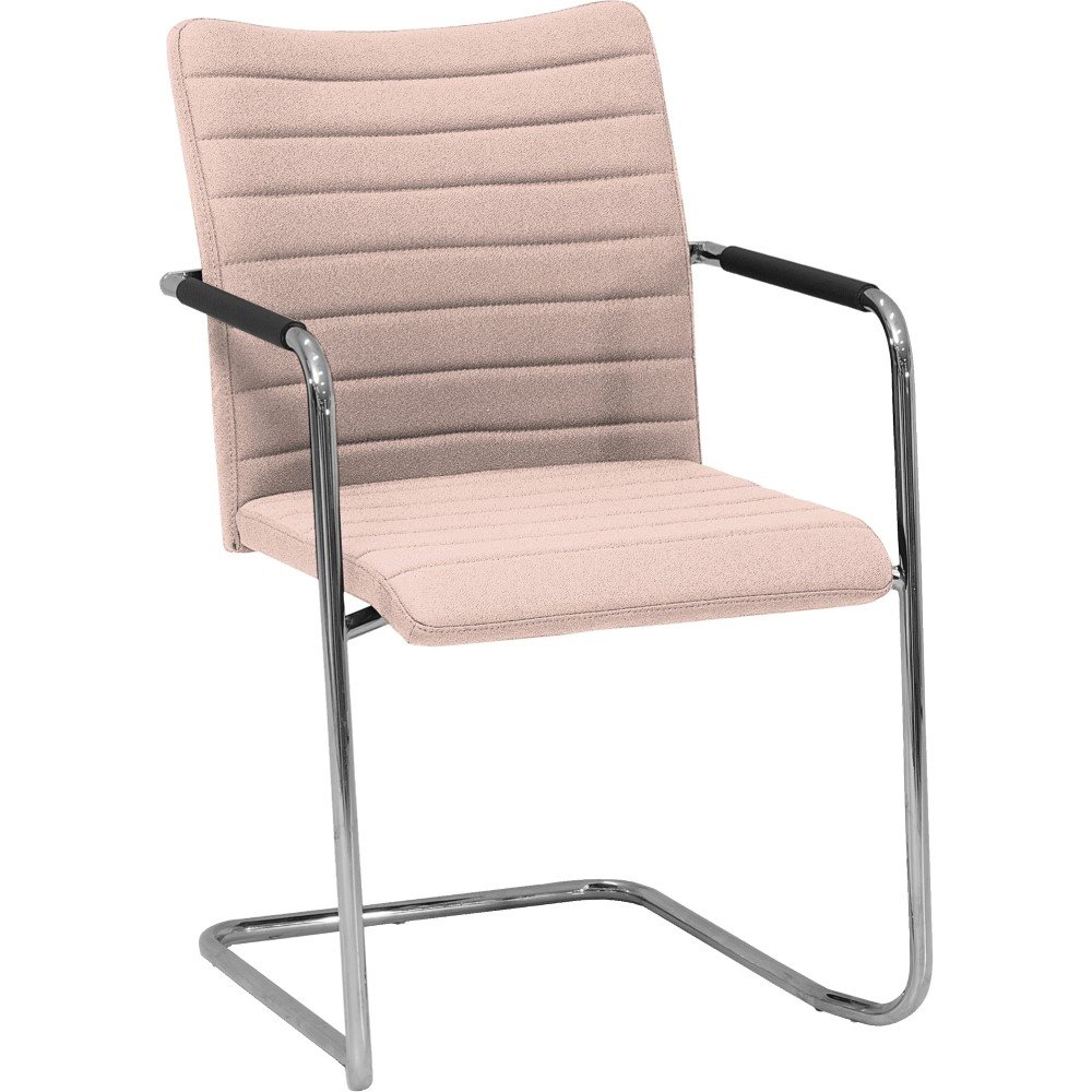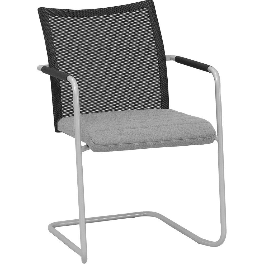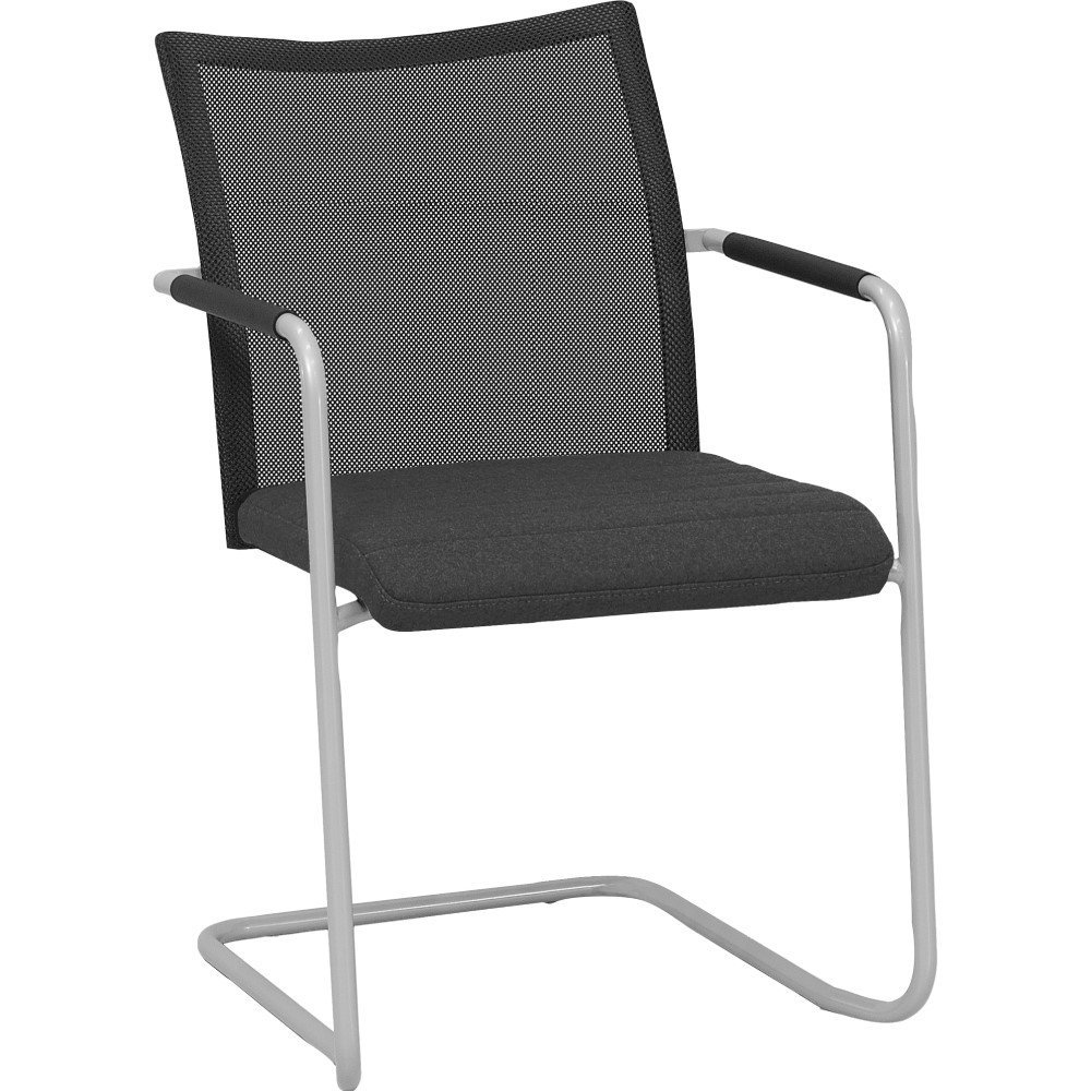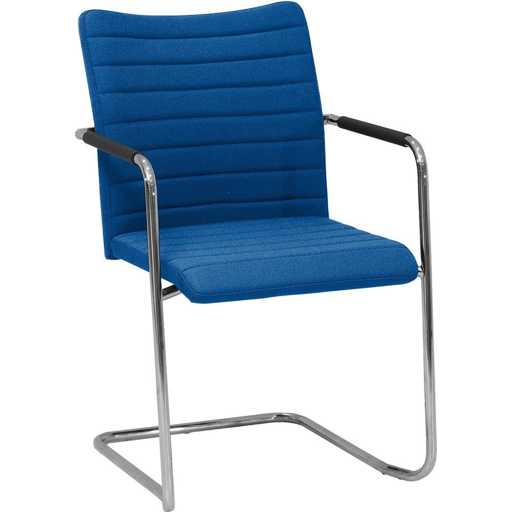 Vergaderstoel Alfa slede met hoge rug en lijnen in de stoffering, heeft een comfortabele zitting wat de stoel een favoriet maakt tijdens vergaderingen. De hoge rugleuning, armleuningen en licht verende beweging door het sledeframe draagt bij aan het zitcomfort. De armleuningen zijn voorzien van een zwart rubberen grip.