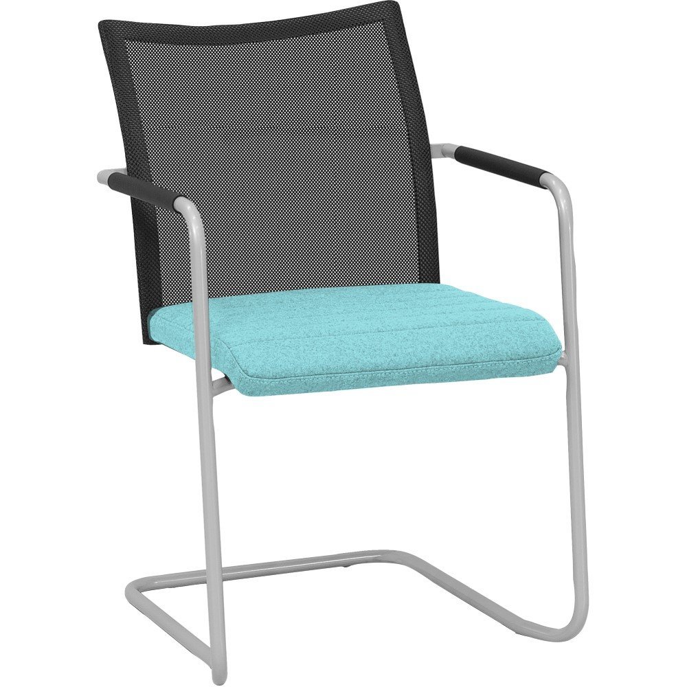 De stevige armstoel is mogelijk in 2 uitvoeringen: volledig gestoffeerd of met een zwart netbespannen rugleuning. Liever de Alfa stoel met sledeframe en een lage rugleuning? Bekijk dan vergaderstoel Alfa slede lage rug met horizontale lijnen.