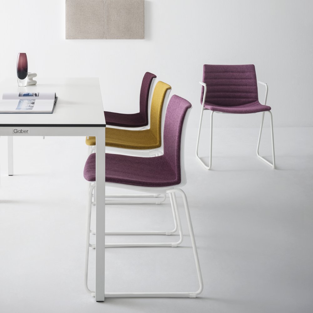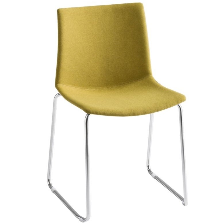 De volledig gestoffeerde stoel is voorzien van stiknaden aan de voorzijde, wat de stoel een moderne en speelse uitstraling geeft. Stoel Point is mogelijk in diverse stoffen en kleuren, net als het sledeframe van de stoel. Zo kunt u heel eenvoudig de uitstraling van de stoel bepalen, zodat deze bij het interieur past.