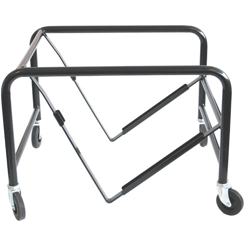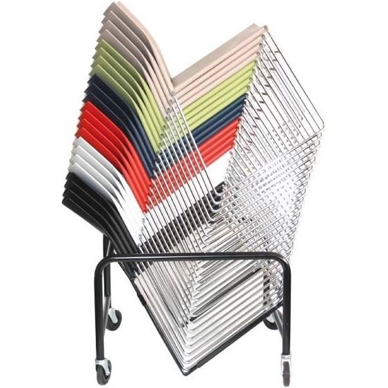 Deze zwarte metalen trolley is verrijdbaar en kan maximaal 30 tot 45 stoelen vervoeren.