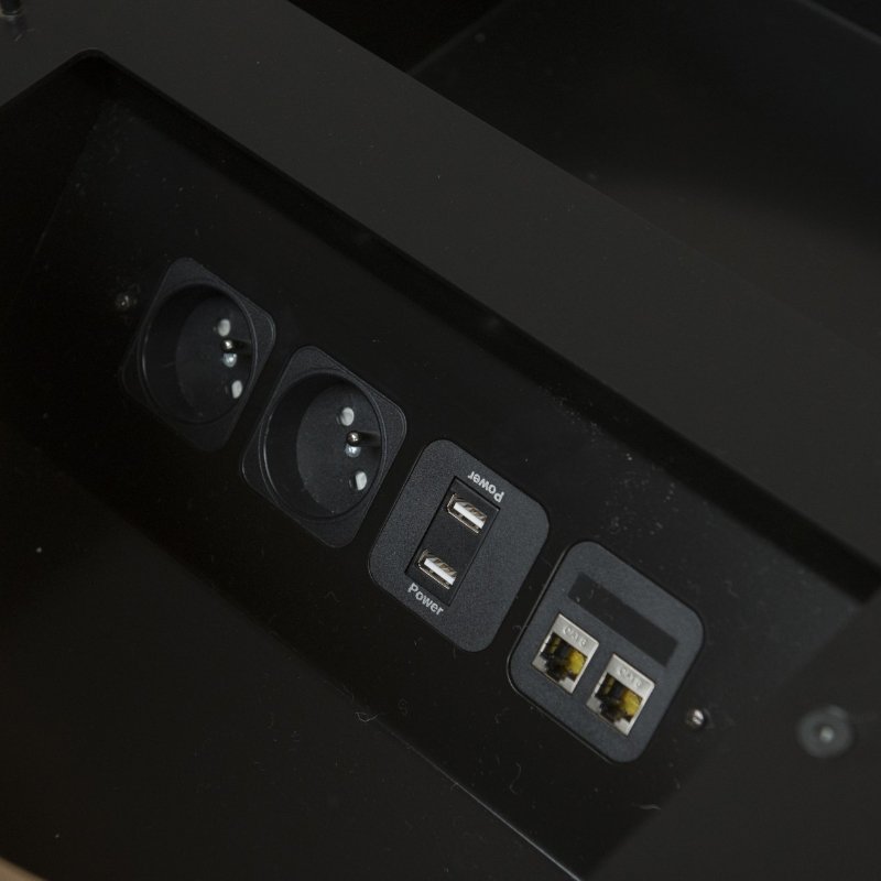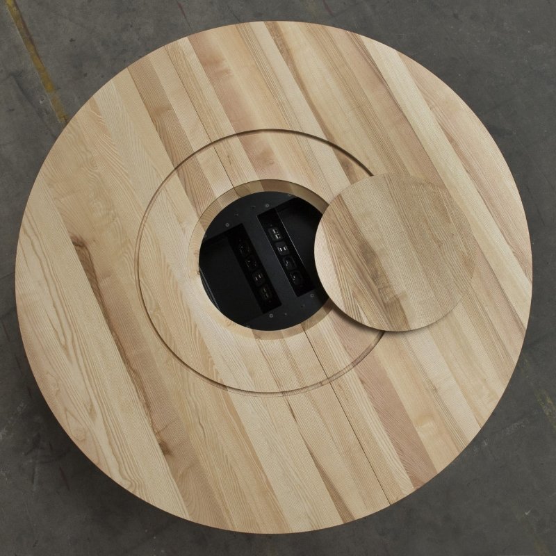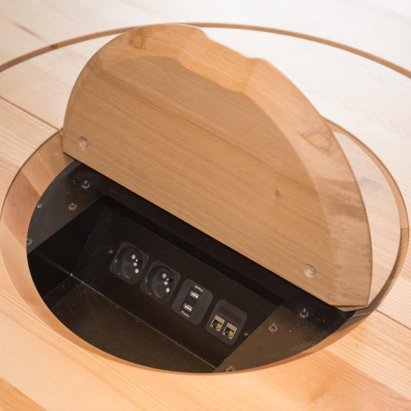 De ronde tafel is leverbaar in diverse uitvoeringen. Zo is er mogelijkheid voor kabeldoorvoer waarbij u een 'deksel' van het tafelblad kan verwijderen of via een scharnier in het midden van de tafel kabels kunt doorvoeren. Zo houdt u uw mobiele apparaten bij de hand terwijl ze worden opgeladen.