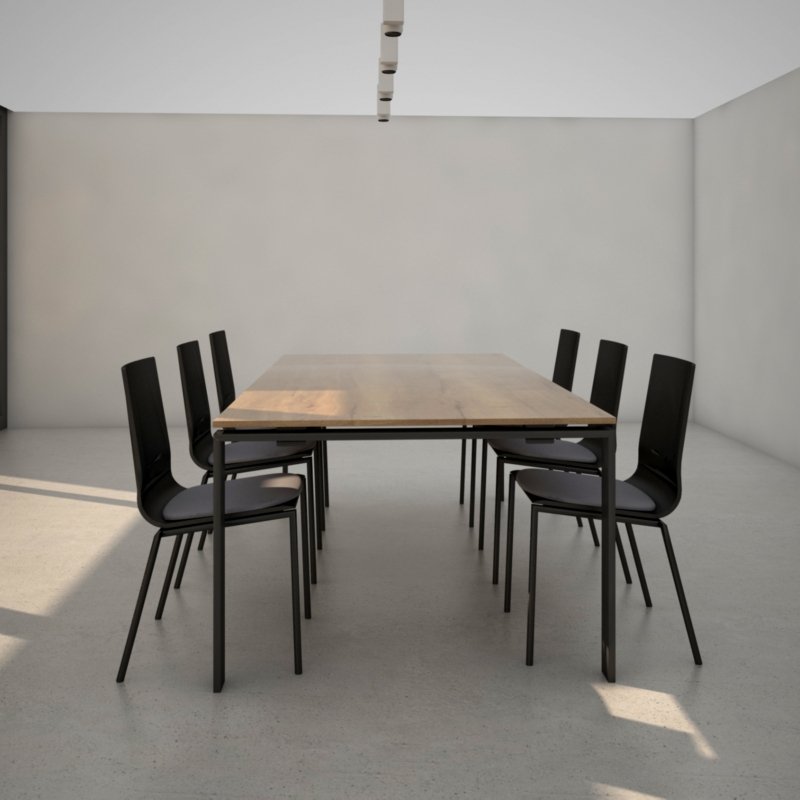 Er passen 6 tot 8 stoelen rondom de tafel.