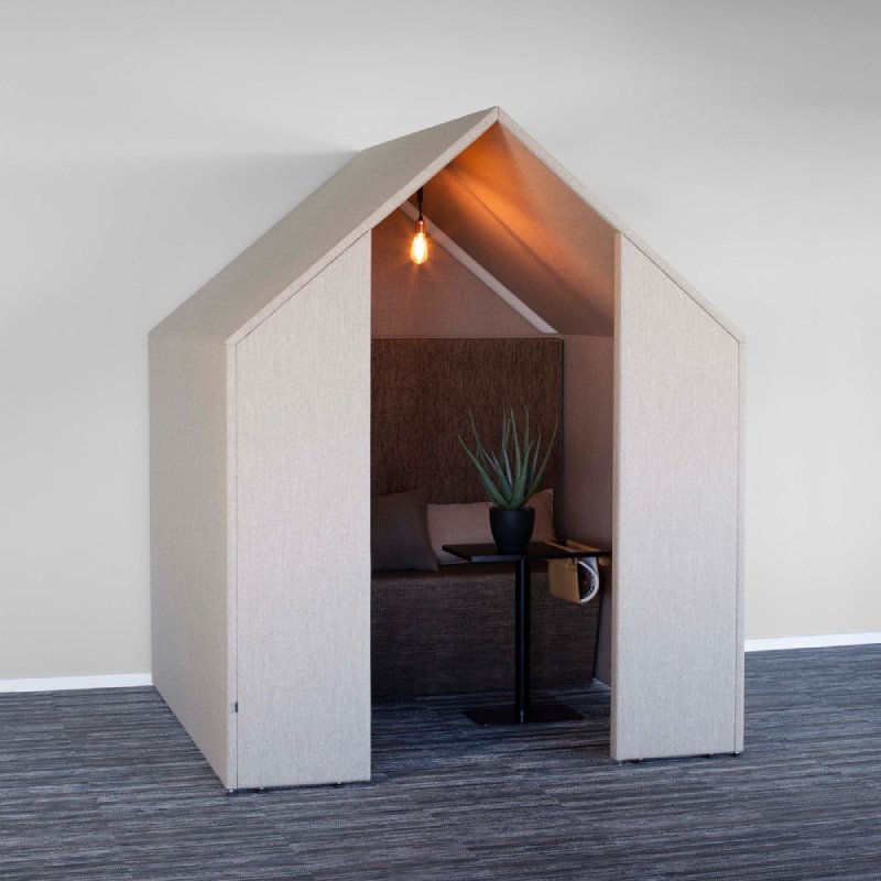 The Hut met frontpanelen is een akoestisch huisje voor op de werkvloer. Het ontwerp van het huisje is geïnspireerd op de speelstukken uit het bordspel Monopoly. De overlegplek heeft een tijdloos design en heeft een praktisch 'room in room' concept. Door de wanden en het dak worden de omgevingsgeluiden gedempt en kunt u hier in alle rust zitten, overleggen of werken.