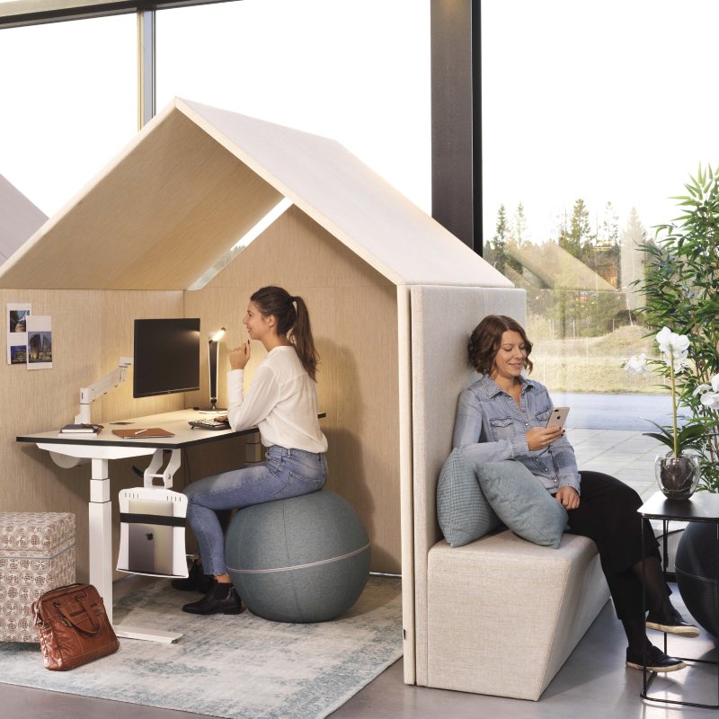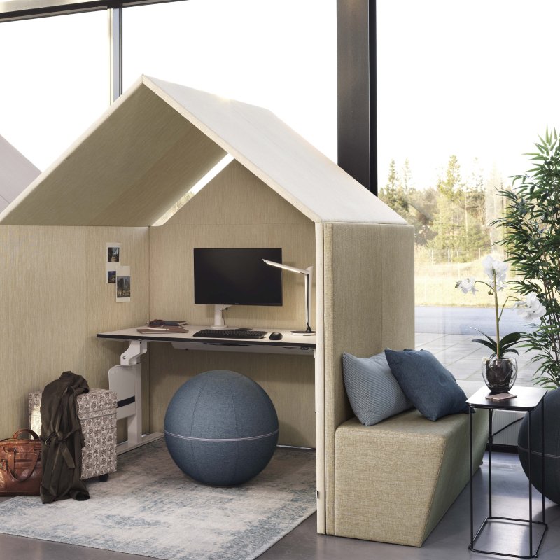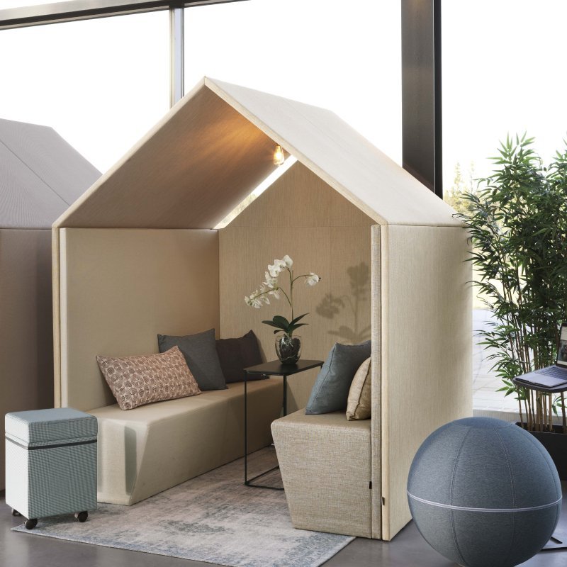 Hut Sofa bestaat uit een comfortabele sofa bank die verbonden is aan een zijmuur. Door deze wand wordt er een rustige omgeving gecreëerd op de werkvloer.