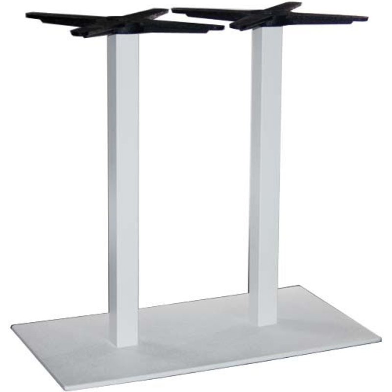 SC293, een stabiel tafelonderstel met een dubbele kolompoot. Dit stalen onderstel is voorzien van een zware rechthoekige voetplaat van 75x40cm en 2 vierkante kolommen met beide een afmeting van 5x5cm. Beide kolommen hebben gietijzeren bladkruizen voor het tafelblad.