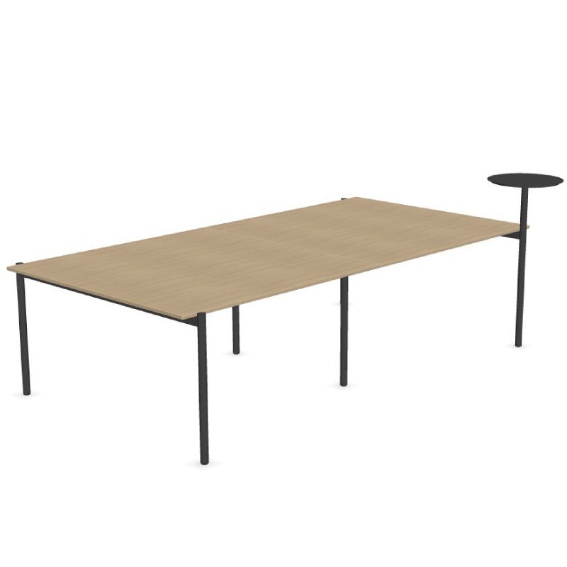 Het belangrijkste element in het ontwerp van deze stijlvolle vergadertafel is het ronde metalen poot aan de buitenzijde van de tafel, die met een speelse plug een bijzonder accent toevoegt aan de algehele uitstraling van de kantoortafel. Deze poot fungeert tevens als een schakel waaraan je diverse accessoires kunt toevoegen.