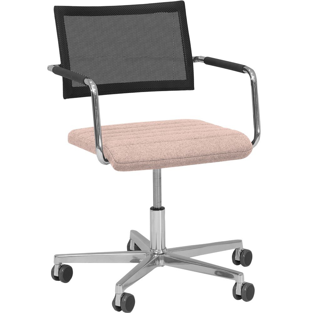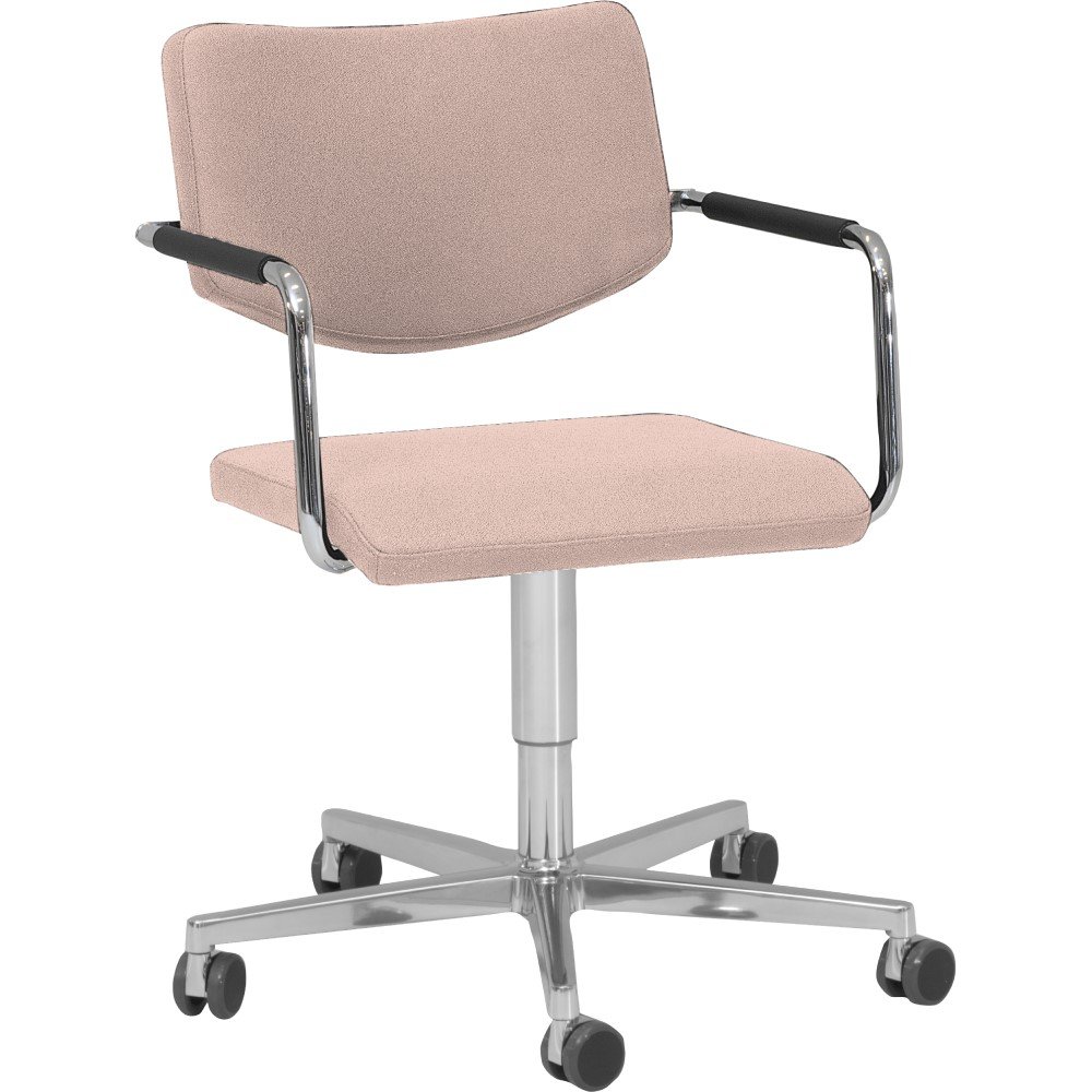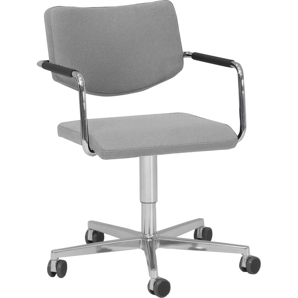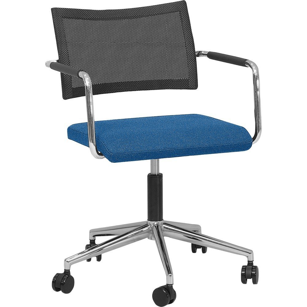 De armstoel is mogelijk met 2 type rugleuningen, gestoffeerd of met zwarte netbespanning voor een licht verende rug. De armleuningen zijn altijd voorzien van zwart rubberen omhulsels.