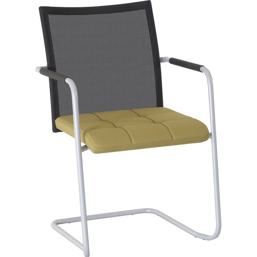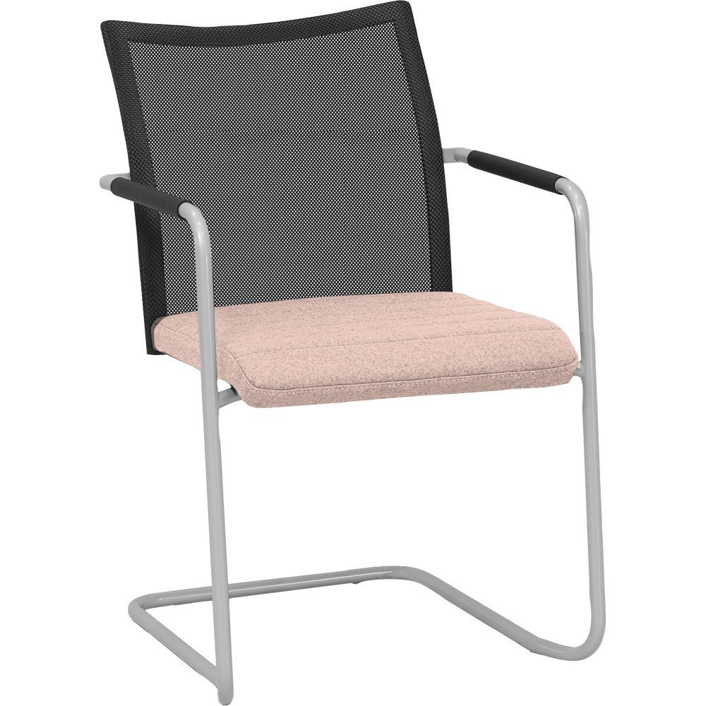De armstoel is mogelijk in 2 uitvoeringen: volledig gestoffeerd of met een zwart netbespannen rugleuning. Liever de Alfa stoel met sledeframe en een lage rugleuning? Bekijk dan vergaderstoel Alfa slede lage rug.
