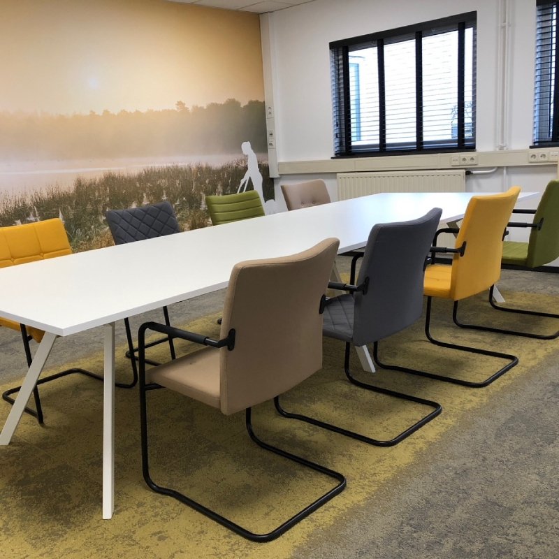 Plaats de gestoffeerde stoel aan een bijpassende vergadertafel. Benieuwd hoeveel stoelen aan uw tafel passen? Lees dan hier hoeveel personen aan de tafel passen.