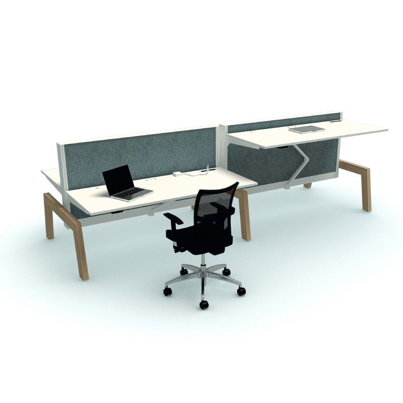 De vier persoons zit sta werktafel Max Hybrid biedt werkplekken voor 4 personen die door middel van een frame aan elkaar verbonden zijn. De tafelbladen zijn in hoogte in-/verstelbaar van 65-128cm zodat u kunt variëren in zit-sta hoogte. De bureaus zijn van elkaar gescheiden door middel van een akoestische bureau scheidingswand. Op deze wijze wordt er privacy gecreëerd en worden geluiden geabsorbeerd en gedempt, zodat u minder last heeft van omgevingsgeluiden. Deze vier persoons-werkplekken zorgen voor een nette en opgeruimde werkomgeving.