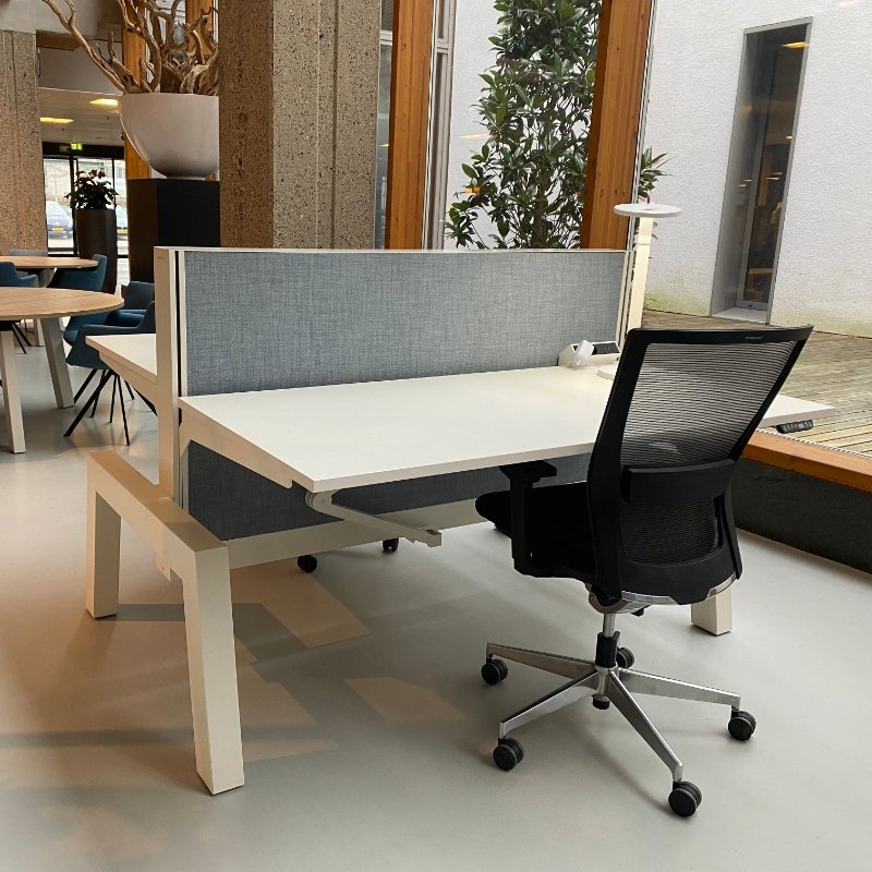 Duo zit-sta bureau Max Hybrid bestaat uit 2 werkplekken die door middel van een frame aan elkaar verbonden zijn. De tafelbladen zijn in hoogte verstelbaar van 65-128cm zodat u kunt variëren in zit-sta hoogte. De bureaus zijn van elkaar gescheiden door middel van een akoestische bureau scheidingswand. Op deze wijze wordt er privacy gecreëerd en worden geluiden geabsorbeerd en gedempt zodat u minder last heeft van omgevingsgeluiden. Deze duo-werkplekken zorgen voor een nette en opgeruimde werkomgeving.
