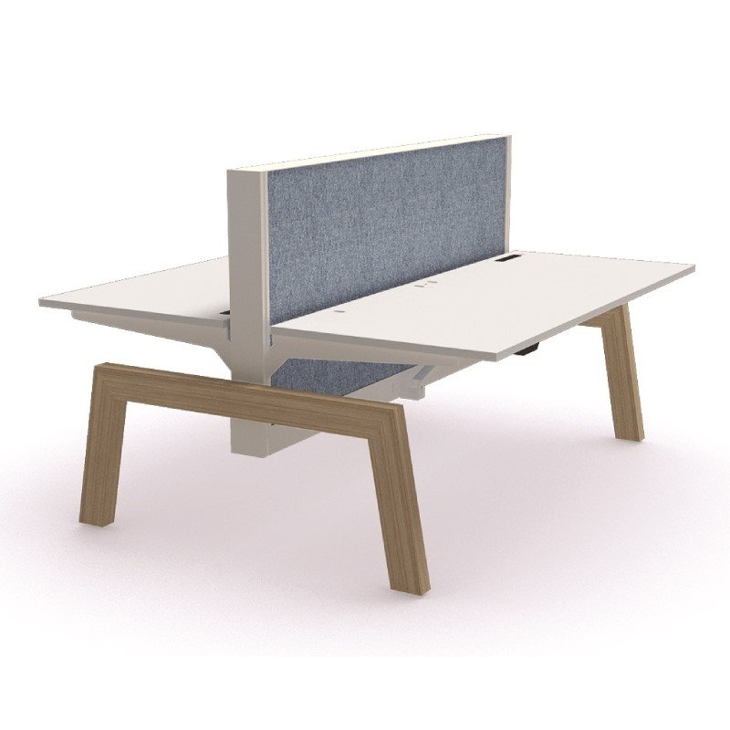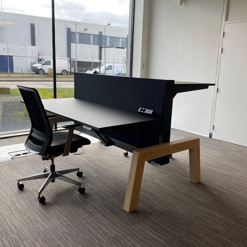 Het Hybrid bureau kenmerkt zich door de stijlvolle houten poten en stofkleuren. Het bureau voor 2 personen  is verkrijgbaar als hoogte instelbaar bureau d.m.v. een inbussleutel of als elektrisch bureau d.m.v. elektrische motoren verwerkt in het bureau.