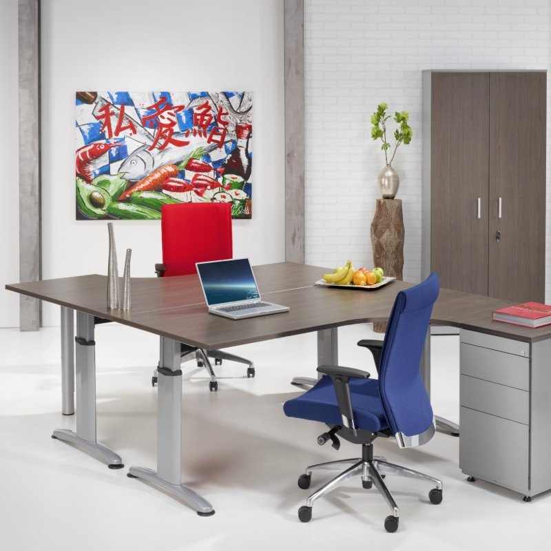 Het bureau in hoekopstelling is leverbaar in diverse bladkleuren en kleur T-poot onderstellen. Het bureau kan in hoogte ingesteld worden van 62 tot 85cm. Dit maakt het arbo bureau geschikt voor zittend werken.