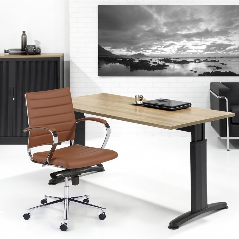 Het Double-T in hoogte instelbaar bureau is mogelijk in diverse afmetingen en is leverbaar in verschillende melamine blad- en metalen frame kleuren.