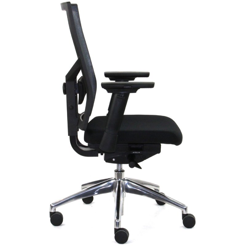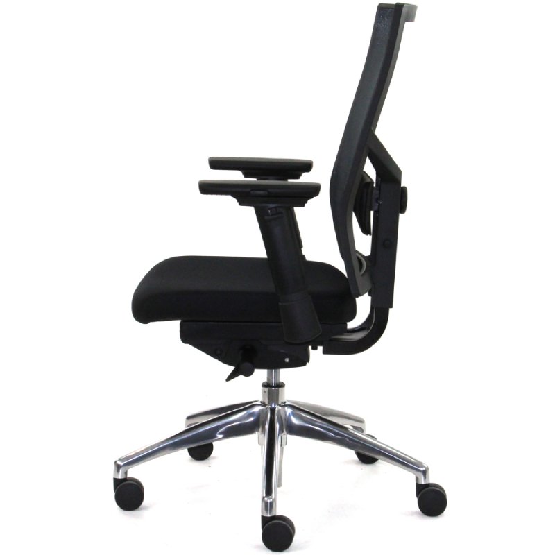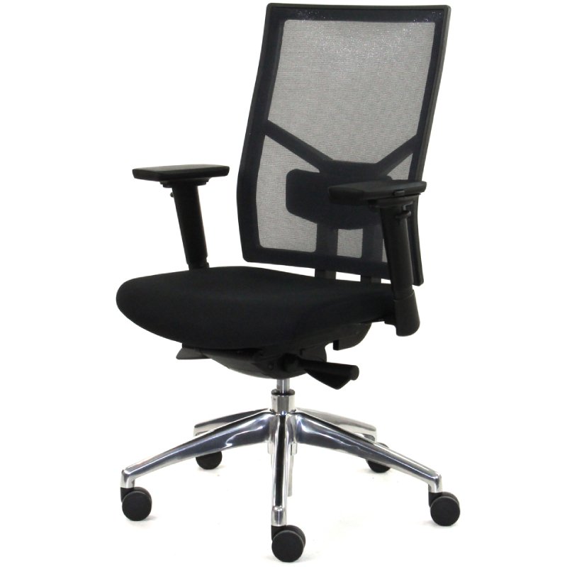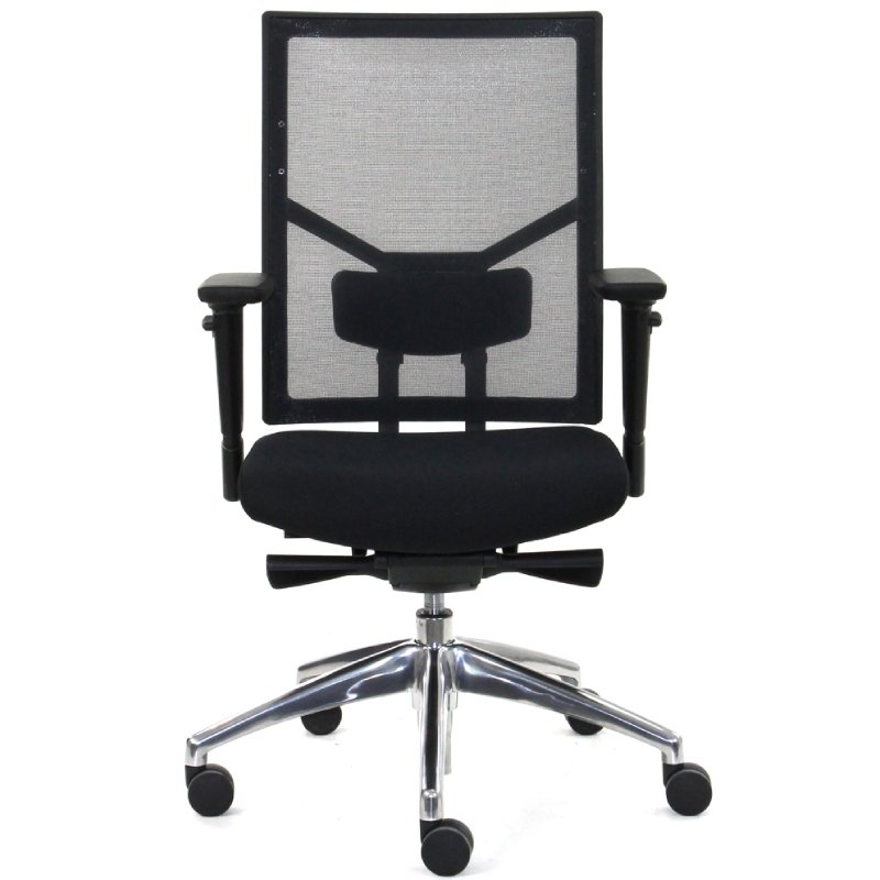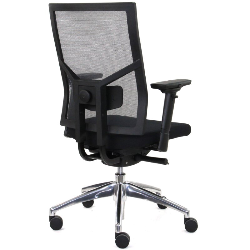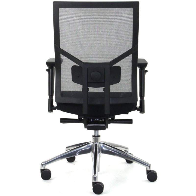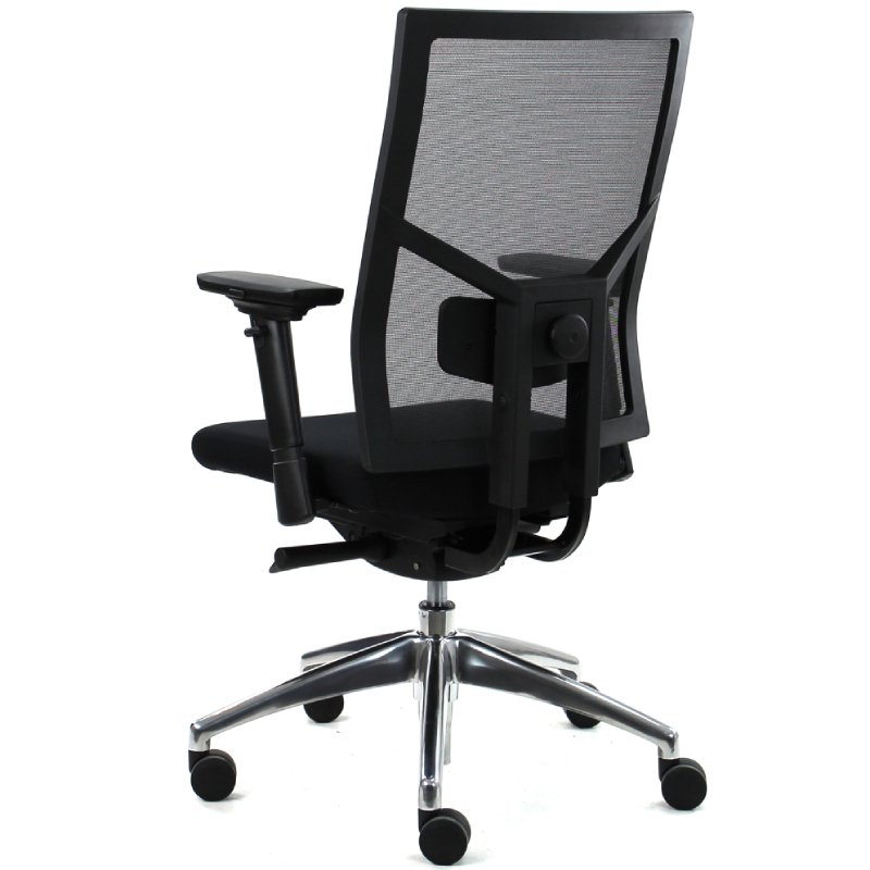 De netbespannen rug en de instelbare armleggers, die niet alleen in hoogte maar ook in breedte en diepte te verstellen zijn, dragen bij aan een ergonomische zithouding. De bureaustoel is uitgerust met een gepolijst aluminium onderstel, voorzien van een verchroomde gaslift en multifunctionele wielen.