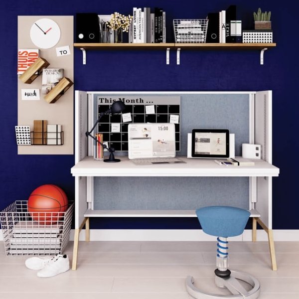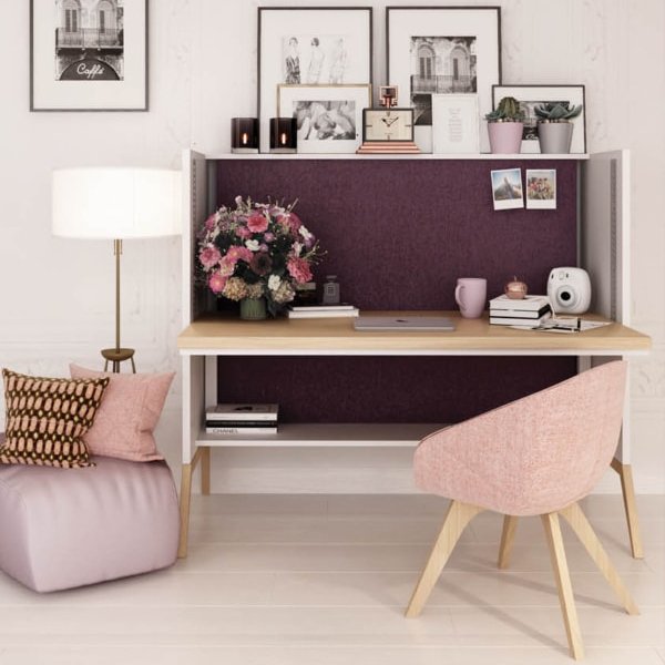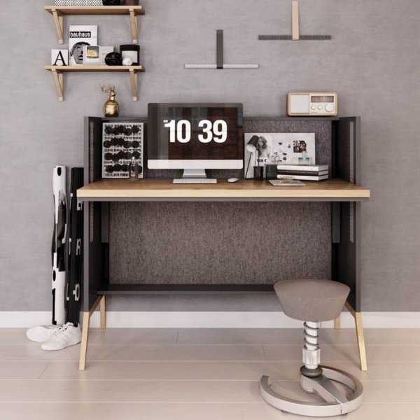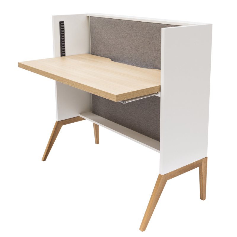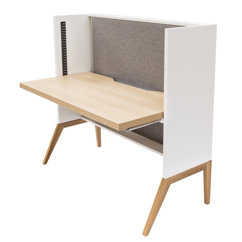 Het werkblad heeft een dikte van 38mm en een afmeting van 117,4 x 60cm. Er is standaard een uitsparing in het blad voor kabelmanagement. Het front en achterpaneel hebben een dikte van 8mm en 1 zijde kan geleverd worden met kurk of stoffering. Het onderstel is van massief eiken. Het werkblad kan maximaal belast worden tot 15kg.