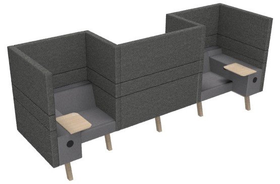 De multifunctionele zitplek bestaat uit 2 individuele werkplekken en 1 duo werkplek voor samenwerkingen. De werkplekken zijn van elkaar gescheiden door akoestische panelen. Hierdoor heeft u geen last van de mensen om u heen.