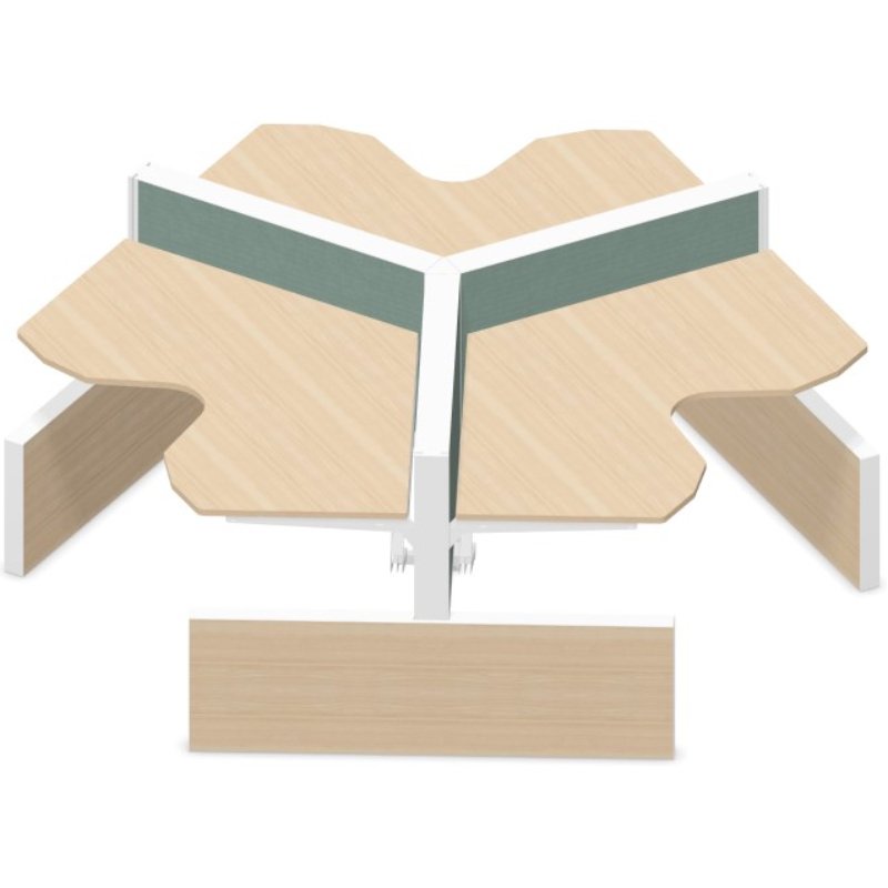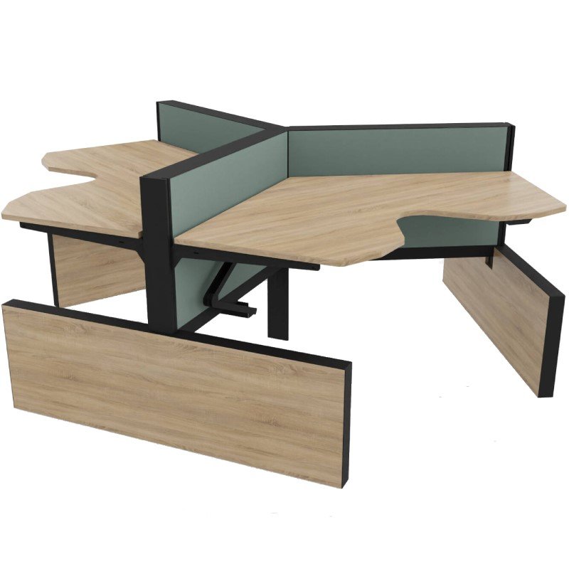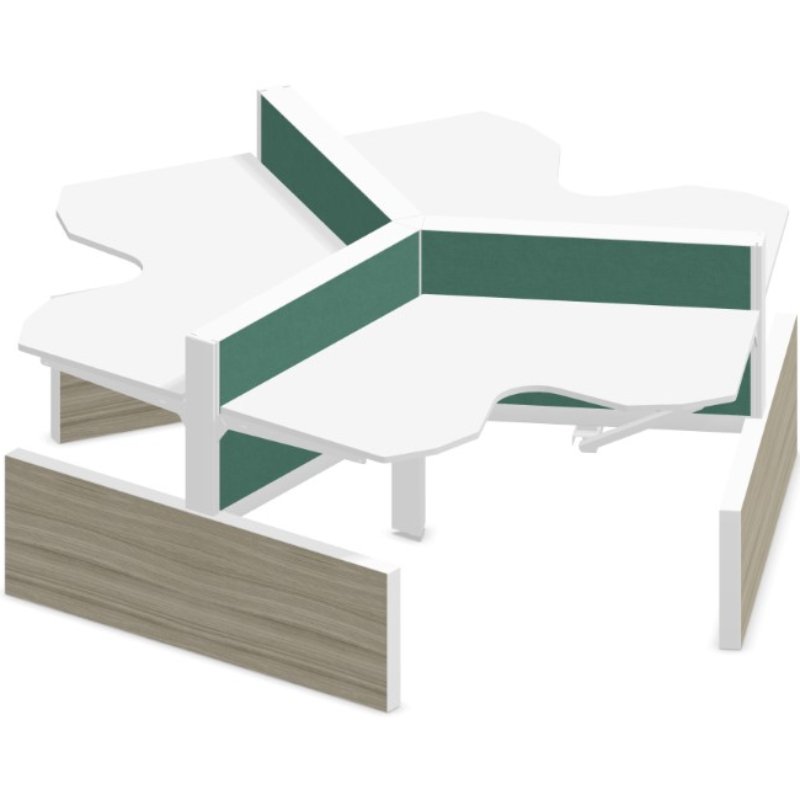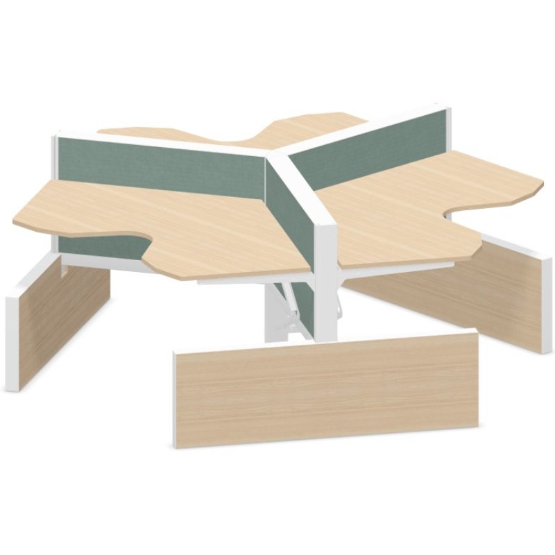 Het bureau bestaat uit een 25mm melamine tafelblad. De werkplekken zijn leverbaar in verschillende kleuren onderstellen. De bureaupanelen hebben een totale hoogte van 120cm en zijn mogelijk in diverse stofkleuren. Alle werkplekken zijn voorzien van elektrificatie in de tussenwand. De werkplekken zijn voorzien van een knik arm, hierdoor worden de kabels onzichtbaar vanuit de tussenwand naar de werkplekken geleid. De bureaus zijn voorzien van zijpanelen die door de diverse houtprints een warme uitstraling hebben.