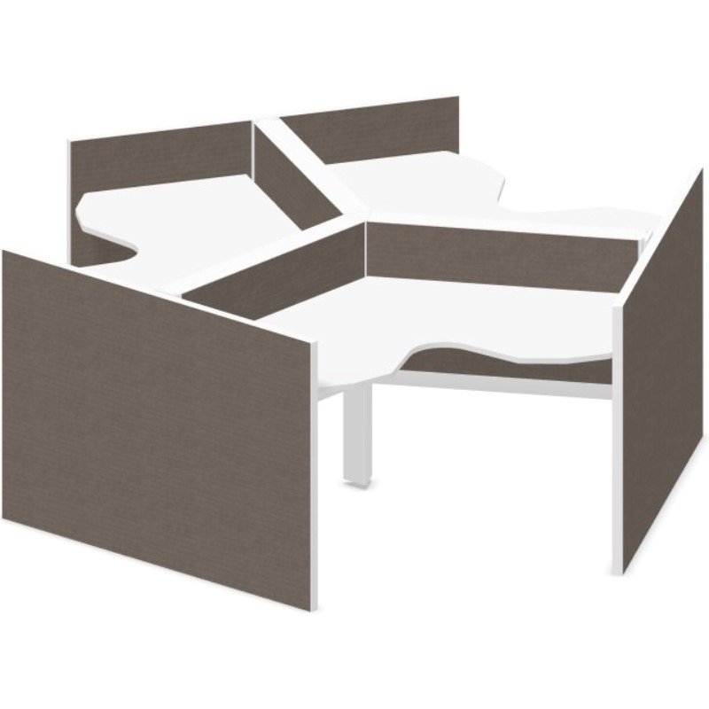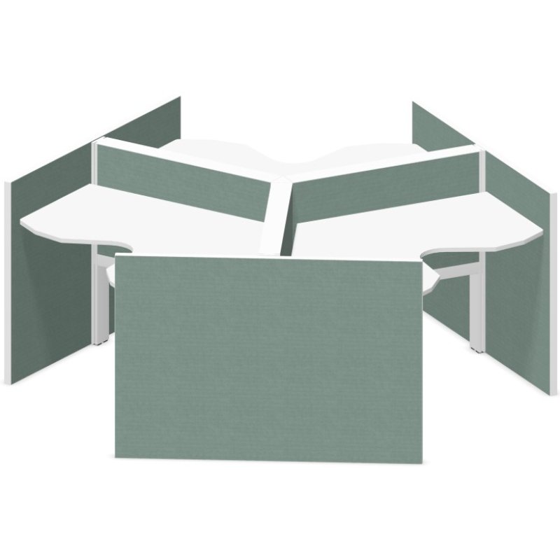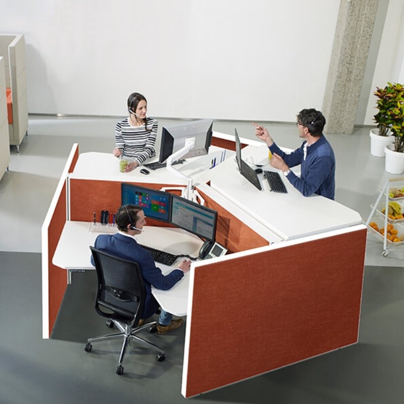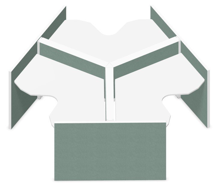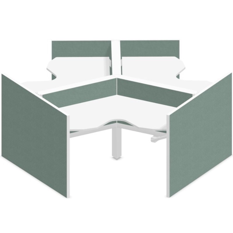 De bureaupanelen van het bureau eiland voor 3 personen hebben een totale hoogte van 120cm en zijn mogelijk in diverse stofkleuren. Alle werkplekken zijn voorzien van elektrificatie in de tussenwand. De werkplekken zijn voorzien van een knik arm, hierdoor worden de kabels onzichtbaar vanuit de tussenwand naar de werkplekken geleid. De bureaus zijn voorzien van gestoffeerde zijpanelen die de werkplekken nog meer privacy bieden.