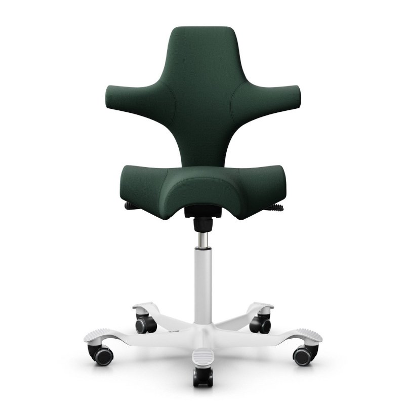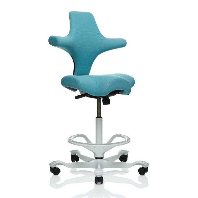 De bekleding van de Hag zadelstoel is verkrijgbaar in diverse stofferingen en kleuren. Het voetster van de comfortabele stoel heeft een anatomisch gevormde aluminium voetensteun. Het framekleur kan gekozen worden in zwart, wit, zilver of aluminium gepolijst.